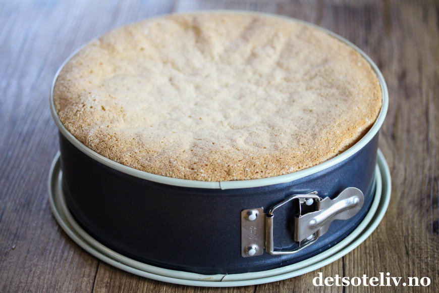 Hell deigen i en rund kakeform (24 cm i diameter) med bakepapir i bunnen. Stek kaken på nederste rille ved 150°C i 55 min.