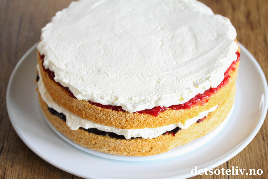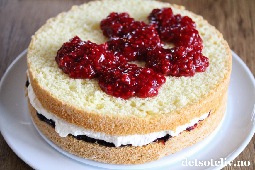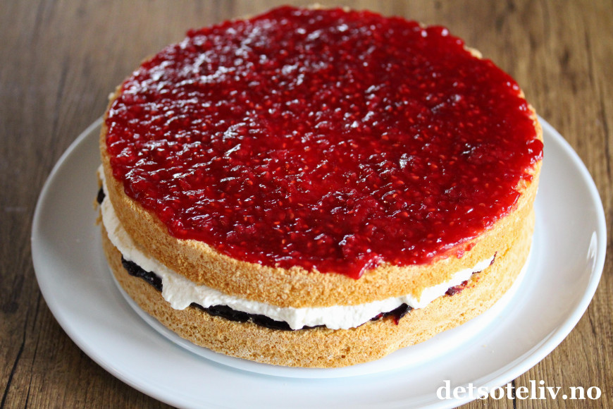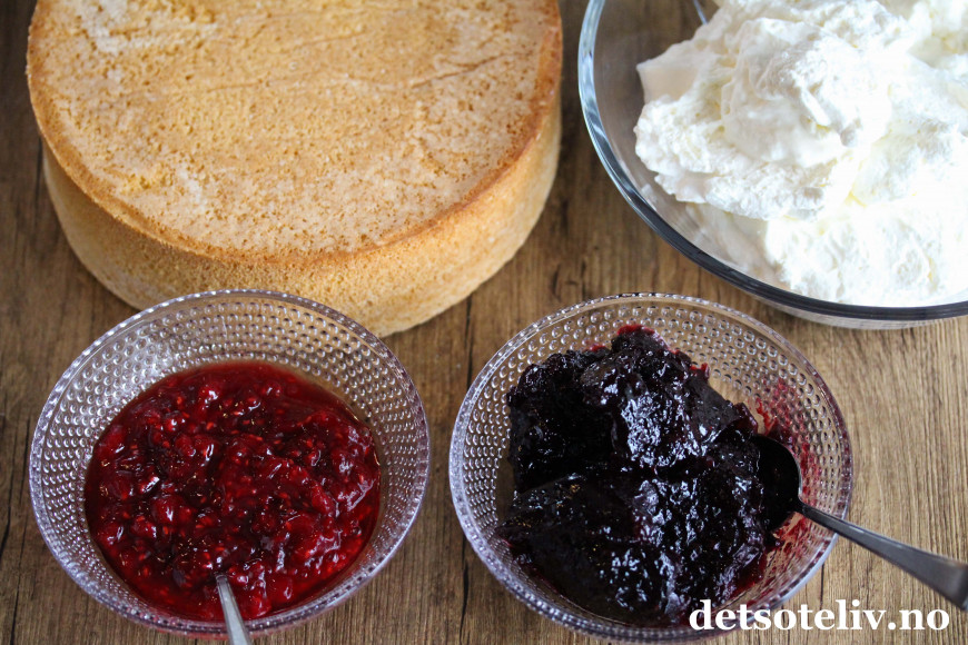Legg på den andre kakebunnen. Dekk med et tykt lag bringebærsyltetøy. Fordel over et tykt lag fløtekrem.