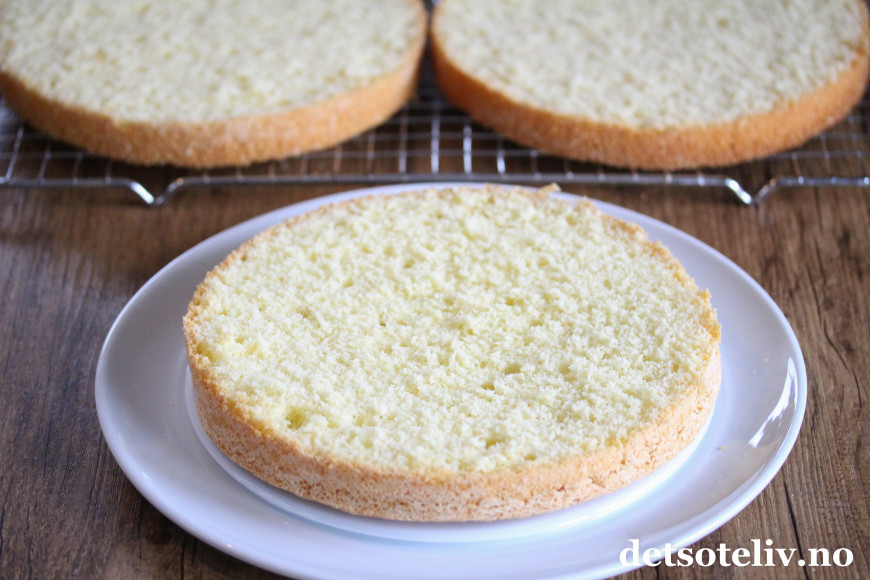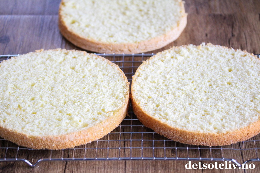Avkjøl kaken helt i formen. Løsne kaken fra formen ved å skjære forsiktig langs kanten med en skarp kniv. Ta kaken ut av formen og fjern bakepapiret. Del kaken i 3 bunner.