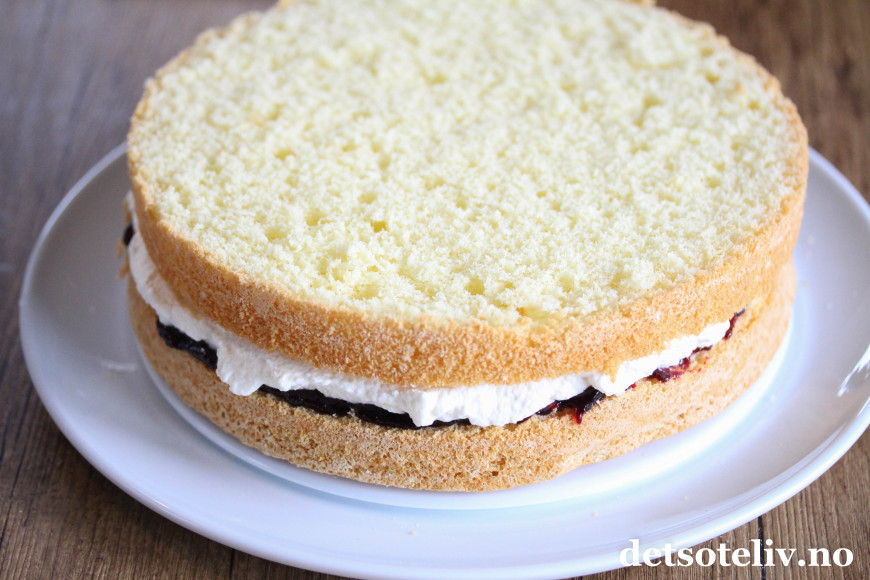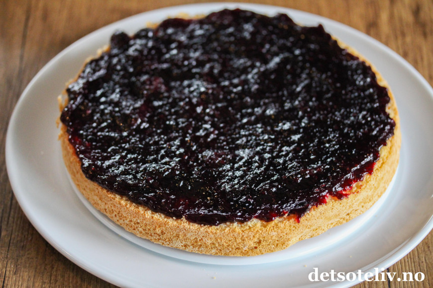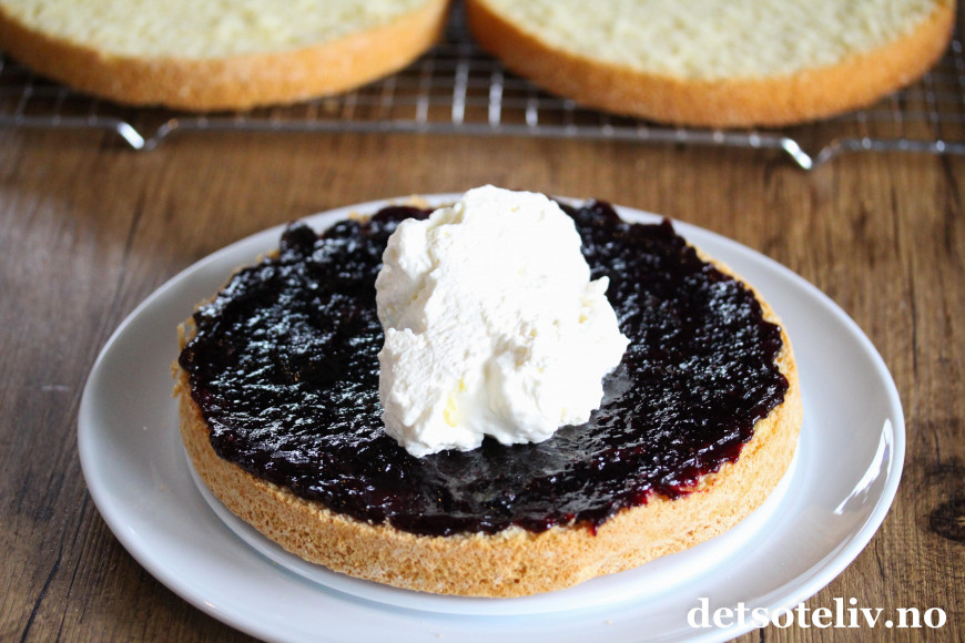 Legg den nederste kakebunnen på et kakefat. Dekk med et tykt lag blåbærsyltetøy. Fordel over et tykt lag fløtekrem.