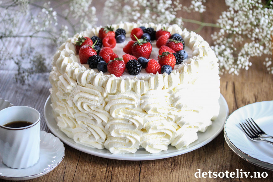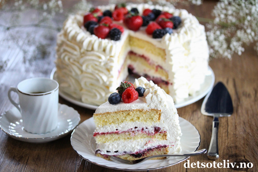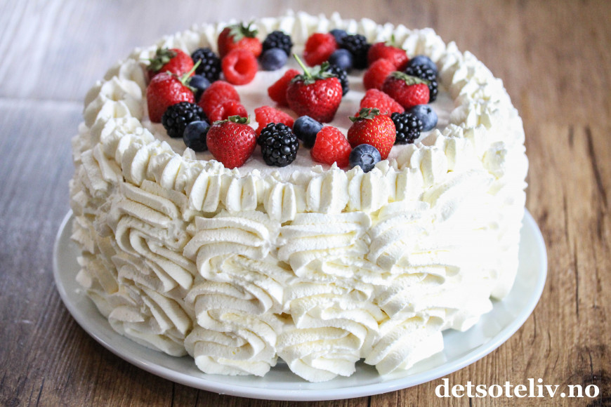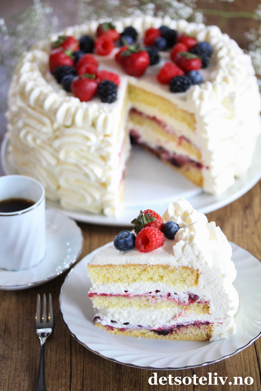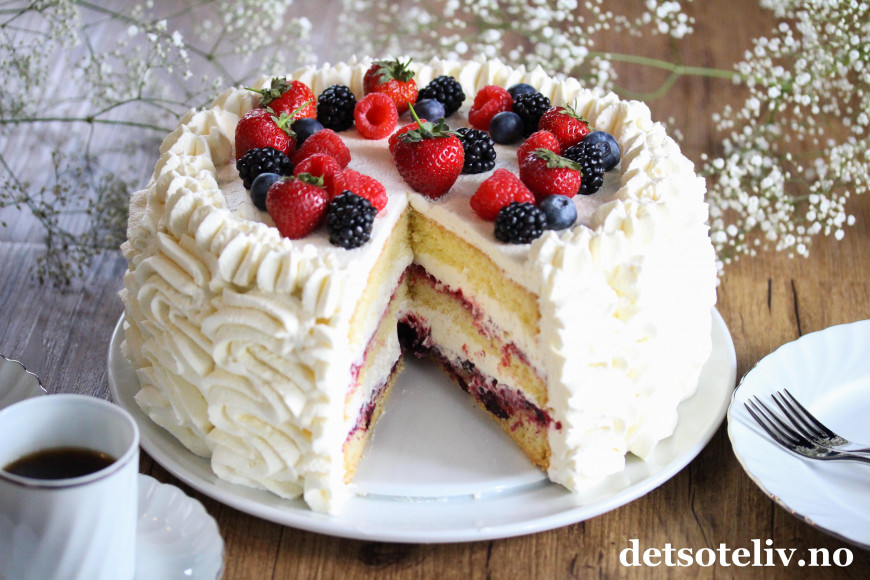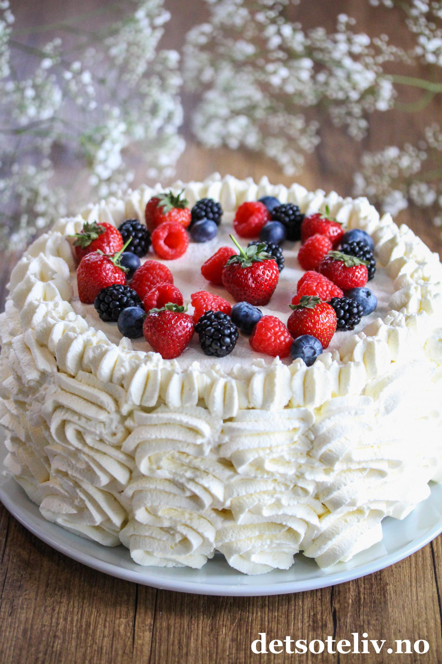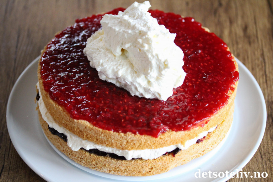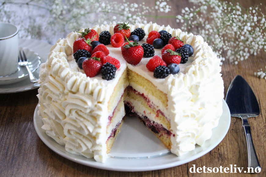 Denne er fylt med hjemmelaget blåbærsyltetøy, hjemmelaget bringebærsyltetøy, friske bær og masse krem.