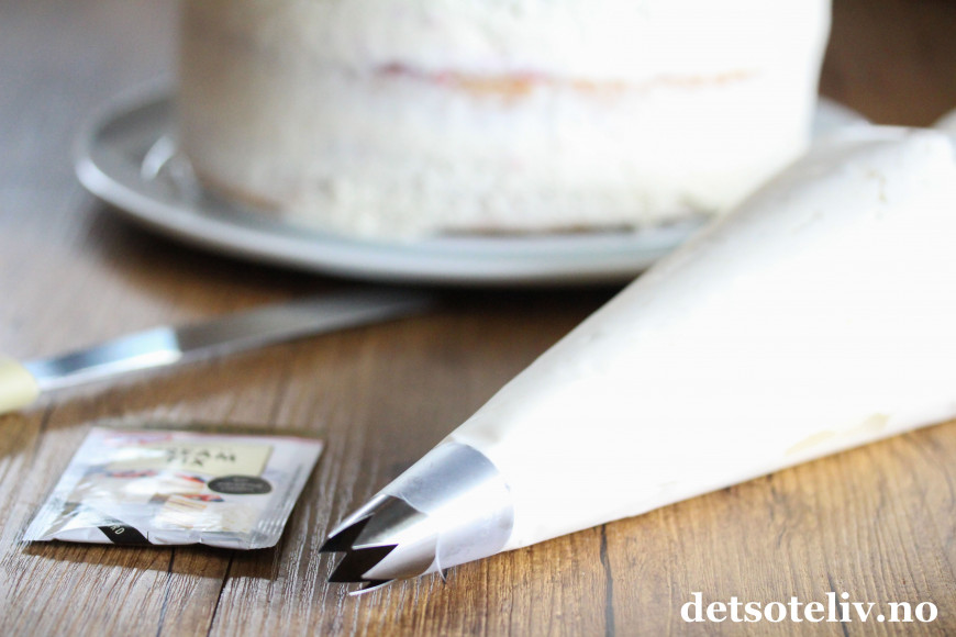 Fordel et godt lag krem rundt hele kaken. Ha resten av kremen i en sprøytepose og sprøyt krem langsmed kanten av kaken.
