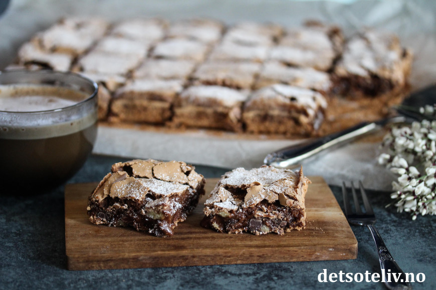 La kaken avkjøles i kjøleskapet til den er helt kald (gjerne over natten, se tips). Løft kaken ut av langpannen og del kaken i firkanter.
