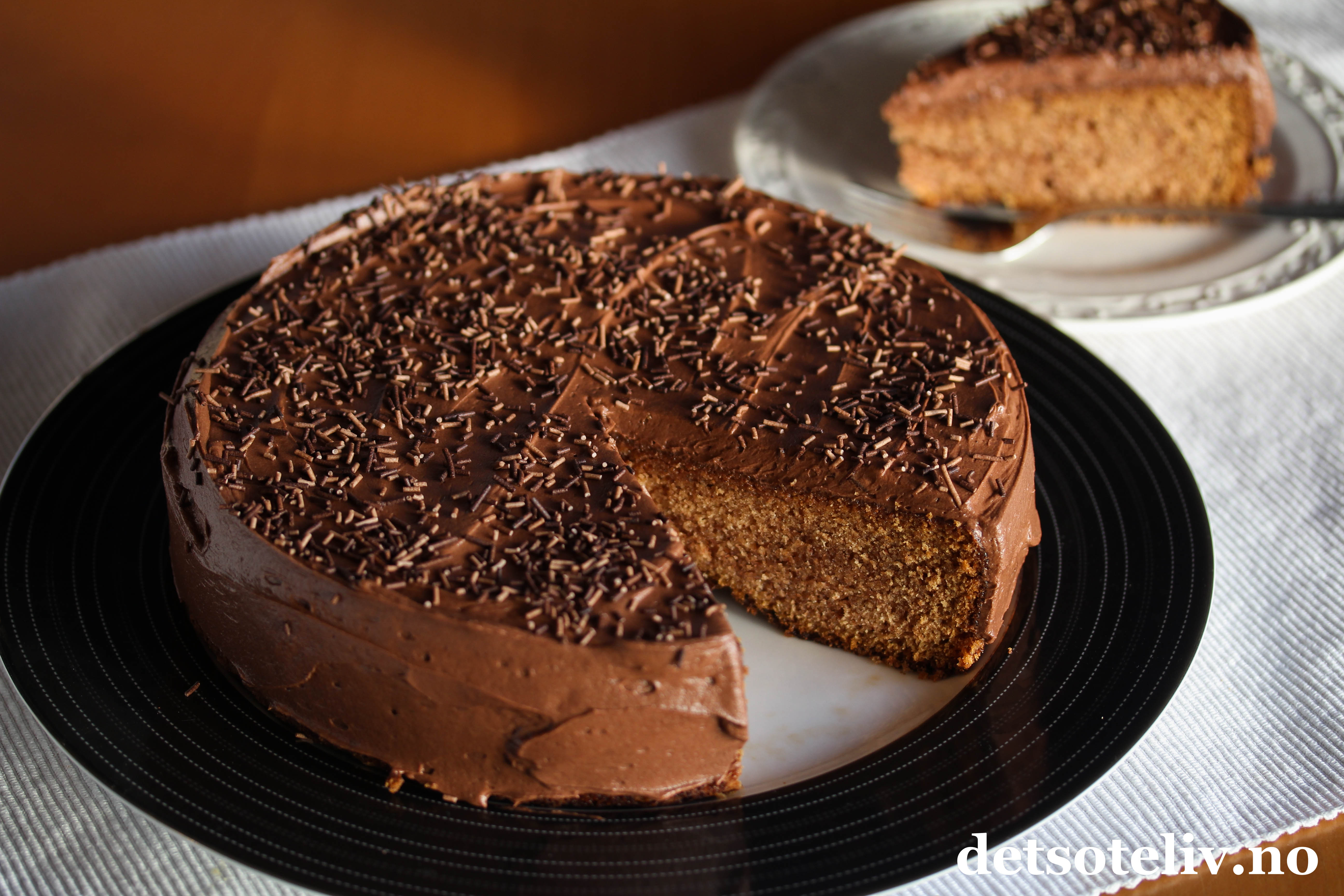 Ha deigen i en rund form (24 cm i diameter) med bakepapir i bunnen. Stek kaken midt i ovnen ved 200°C i 40-45 min. Avkjøl. Løsne kaken fra formen ved å skjære forsiktig langsmed kanten av formen med en skarp kniv. Ta kaken ut av formen og fjern bakepapiret. Sett kaken på et fat.