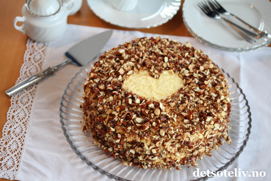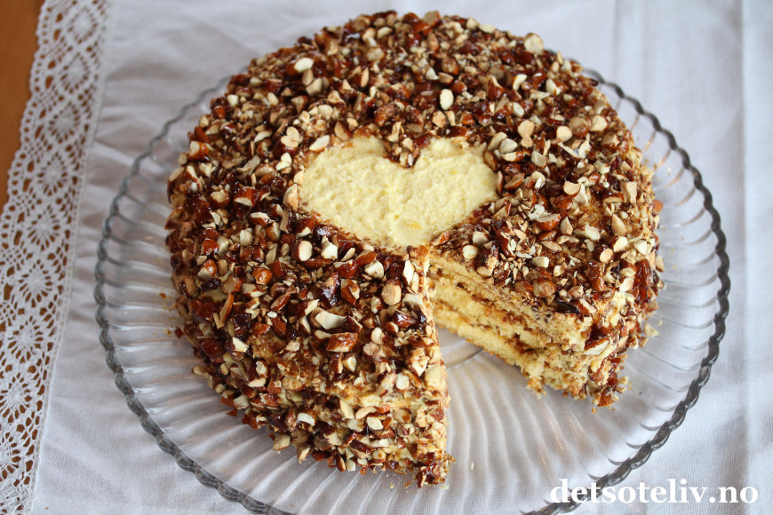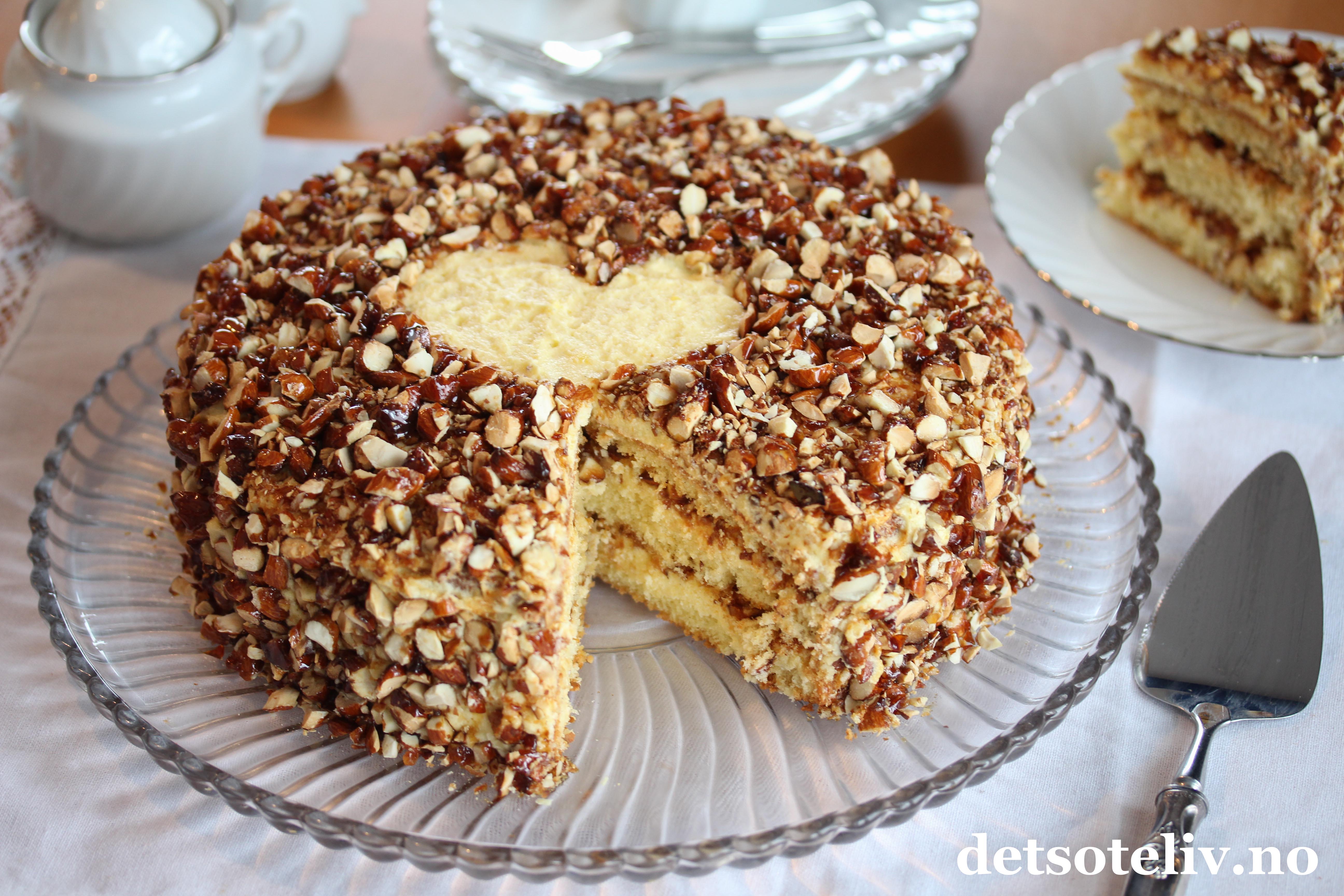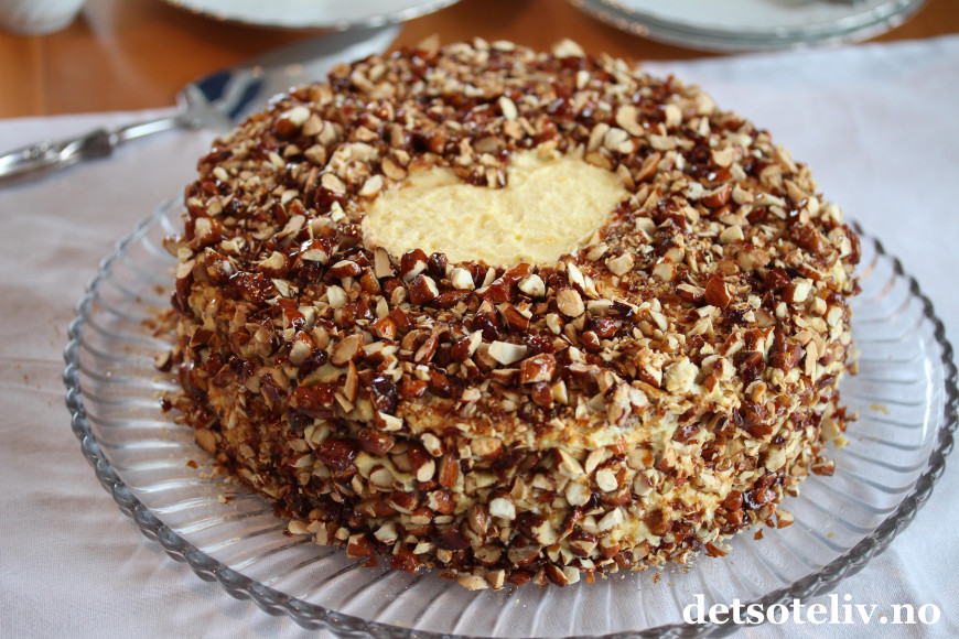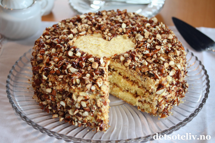 ♥ Hvis du vil ha et hjerte på toppen av kaken, kan du legge på et papirhjerte før du drysser over krokanen. Løft deretter av papirhjertet.