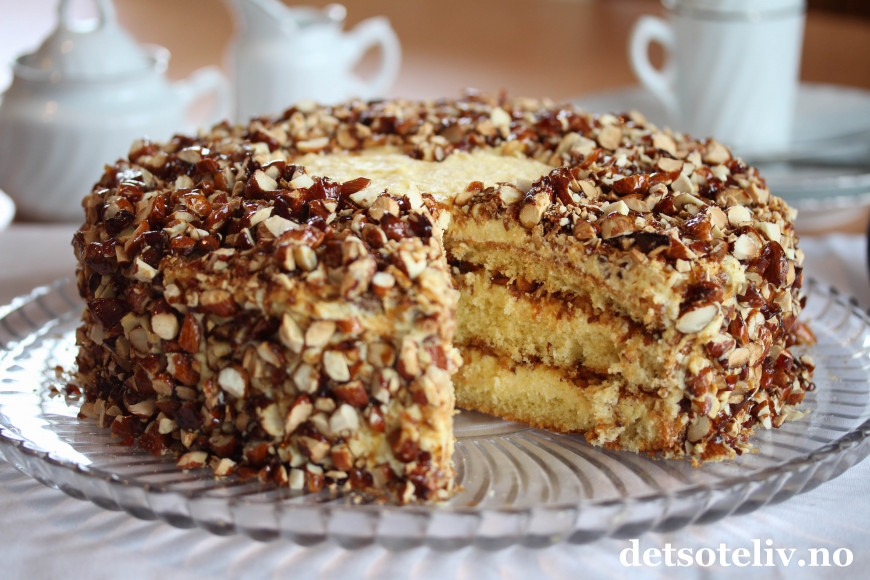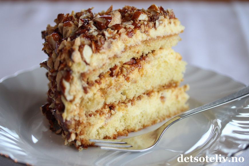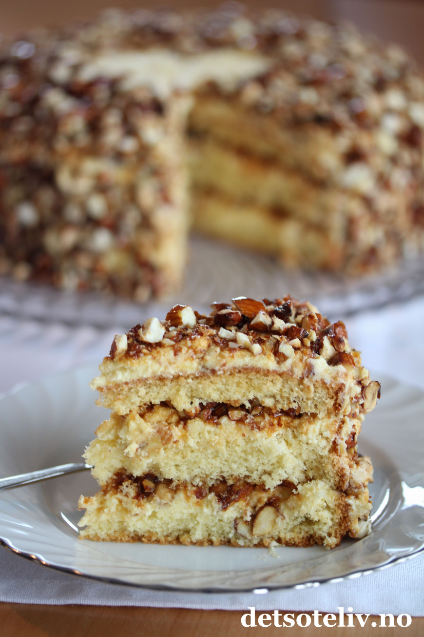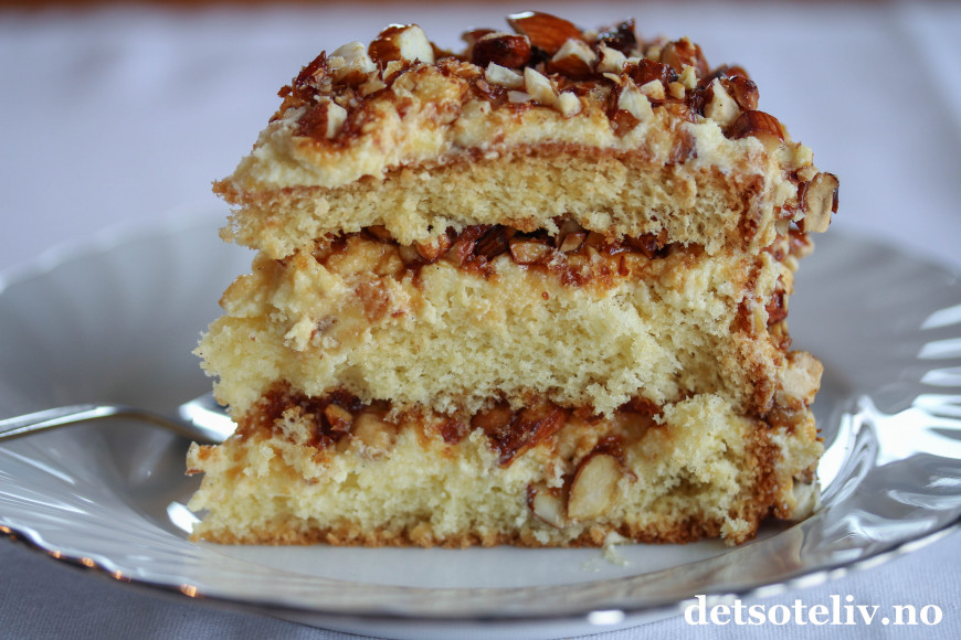Fantastisk med så mye hjemmelaget mandelkrokan i kombinasjon med den luftige sukkerbrødsbunnen og kremete vaniljesmørkremen!