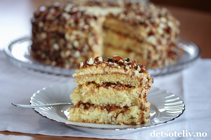 Legg den nederste kakebunnen på et fat. Smør på krem og dryss over krokan.