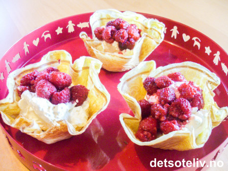 Fylt med pisket krem og bær, blir Krumkakeskåler nydelige porsjonskaker!