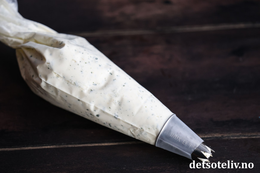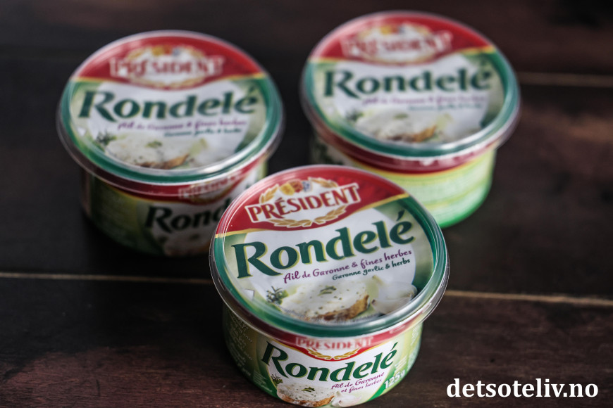 ♥ Kremosten Rondelé har nydelig smak av hvitløk og urter, og jeg synes ikke at det trengs noen ytterligere smakstilsetninger. Det fine med denne kremosten er som sagt at den har en pisket og luftig konsistens, så den er fin å sprøyte ut som den er. Jeg har kjøpt denne osten hos Meny, og brukte 2 stk à 125 gram, altså 250 gram til sammen.