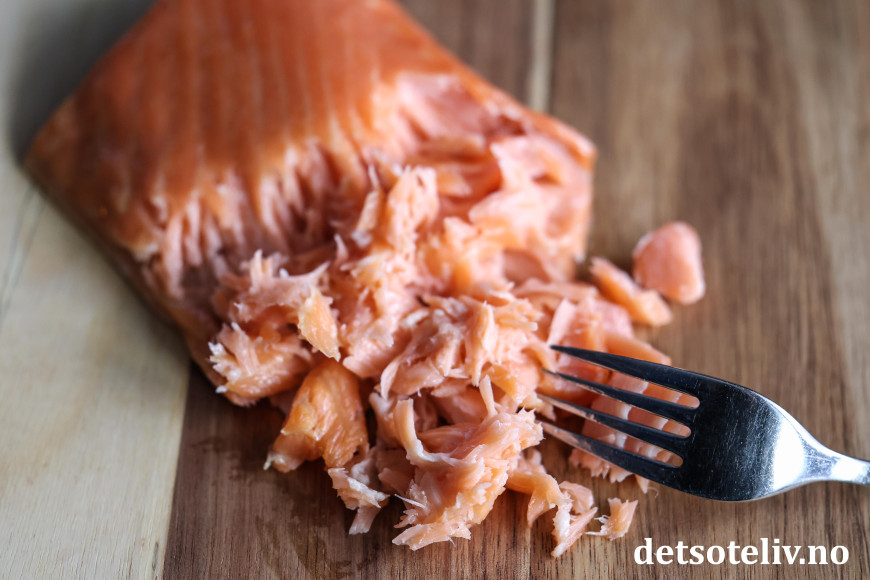 Mos den varmrøkte laksen i mindre biter med en gaffel.
