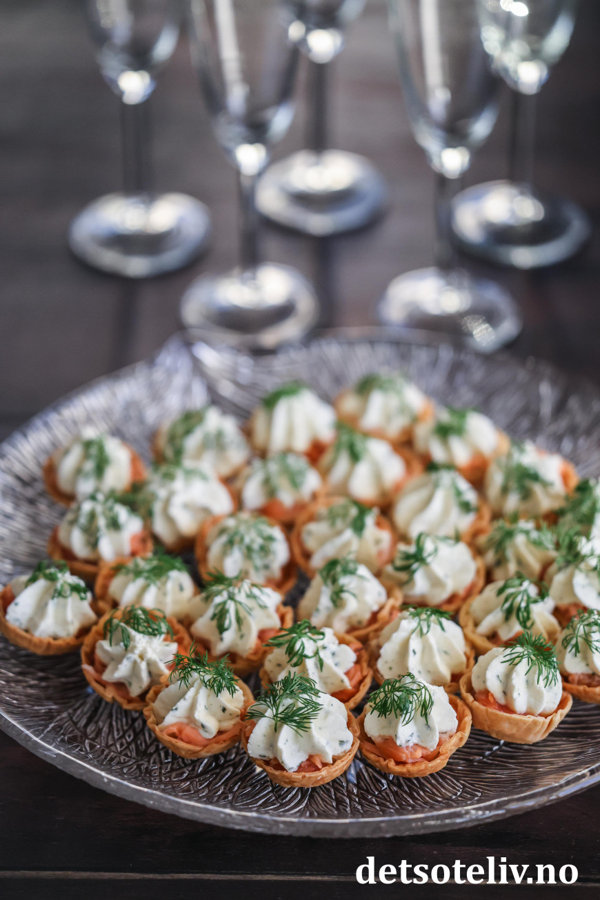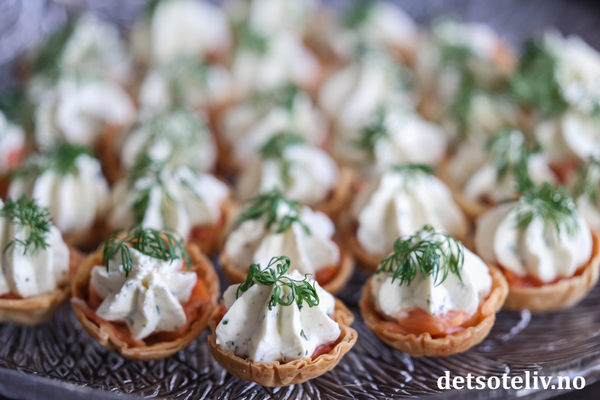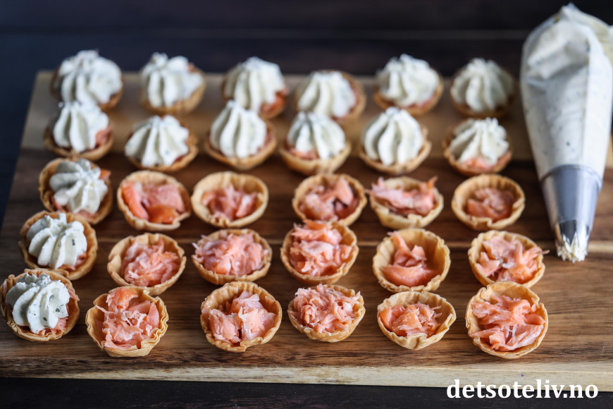 Fyll en teskje varmrøkt laks i hver av krustadene. Topp med litt sprøytet kremost.