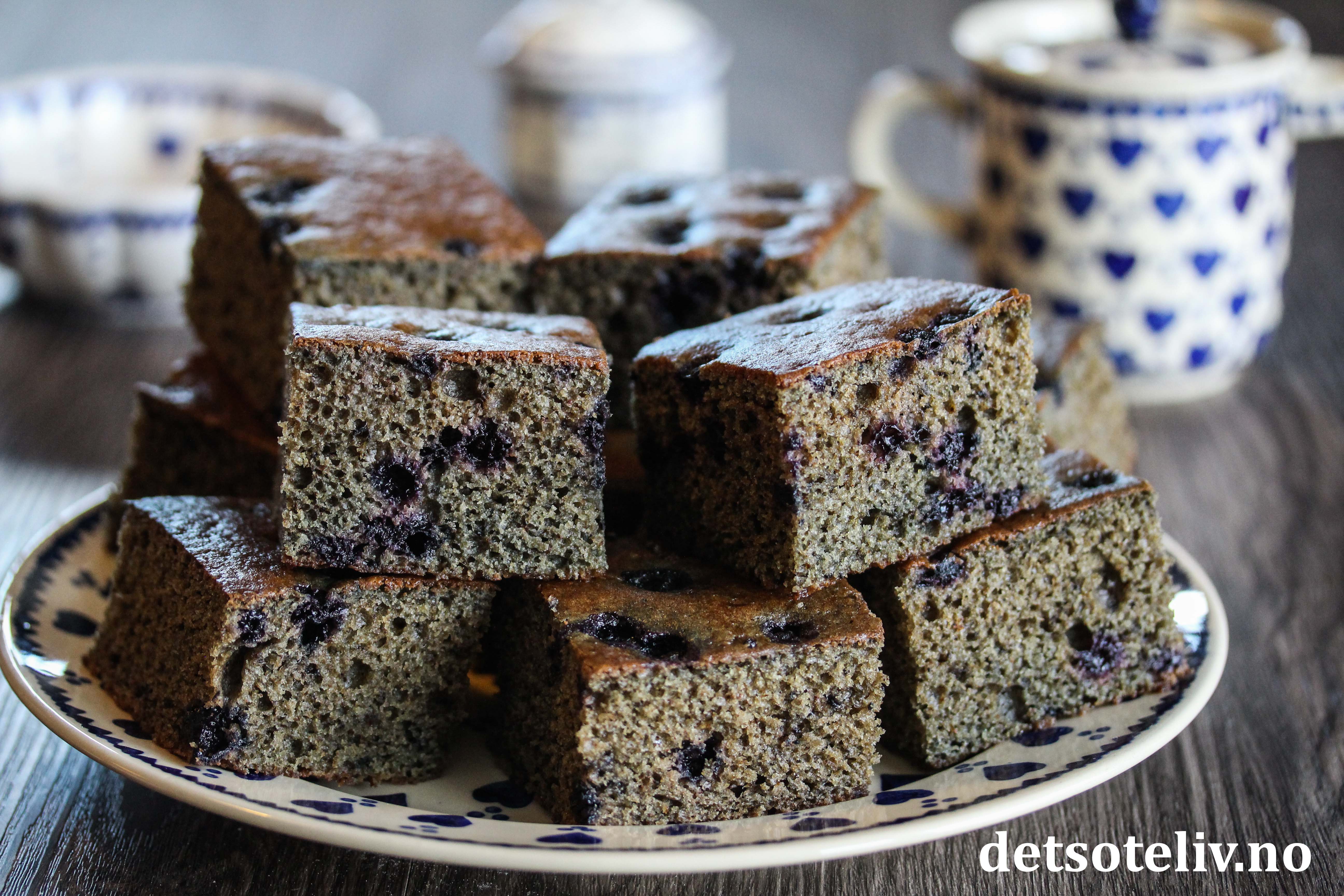 Blåbærsmaken er ikke veldig fremtredende, men blåbærsyltetøy og blåbærene gir kaken et spennende preg.