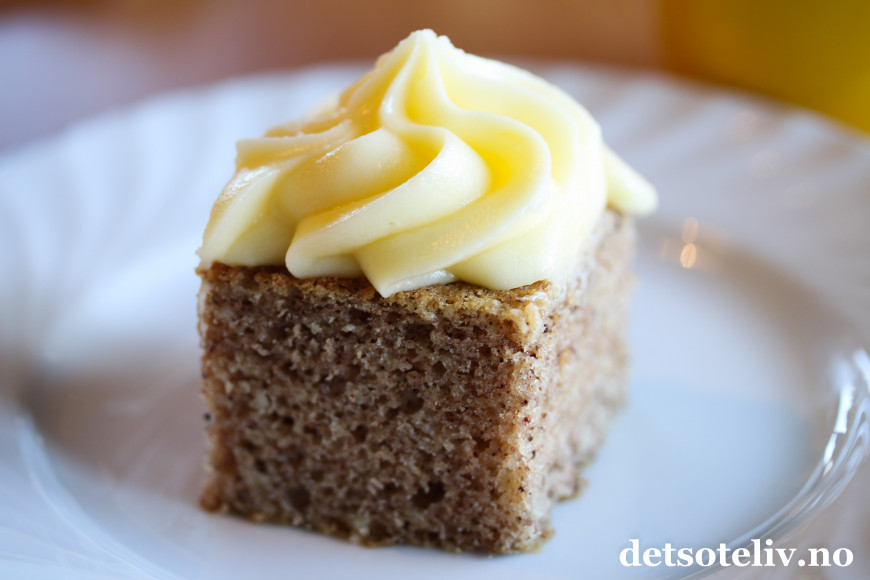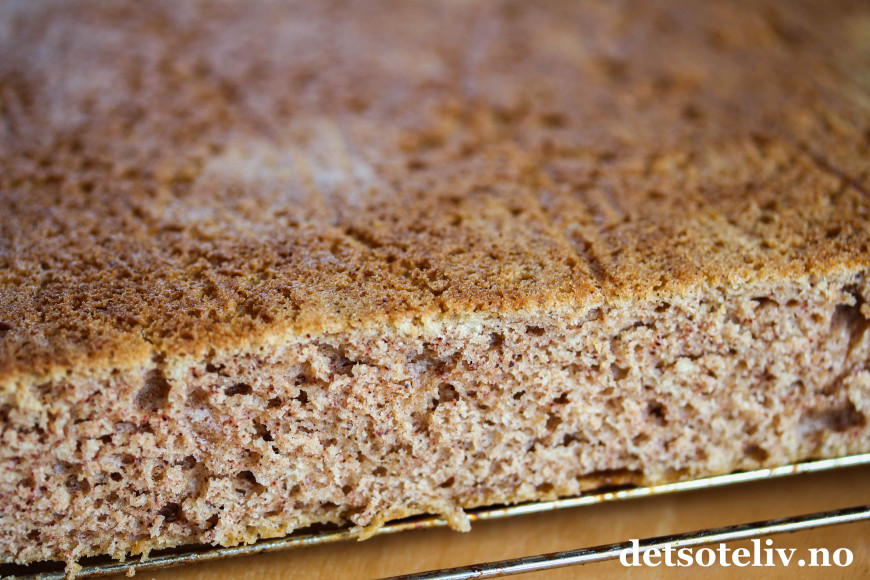 Hell deigen i en stor, bakepapirkledd langpanne (ca 30x40 cm). Stek kaken midt i ovnen ved 180°C i 35 min. Avkjøl kaken helt i formen.