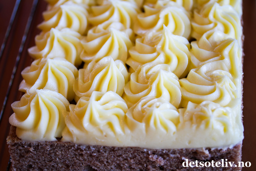 Bre appelsinkremen over kaken eller sprøyt små rosetter av kremen oppå kaken som jeg har gjort her. Hvis du synes appelsinkremen er for bløt, kan du sette den en stund i kjøleskapet.