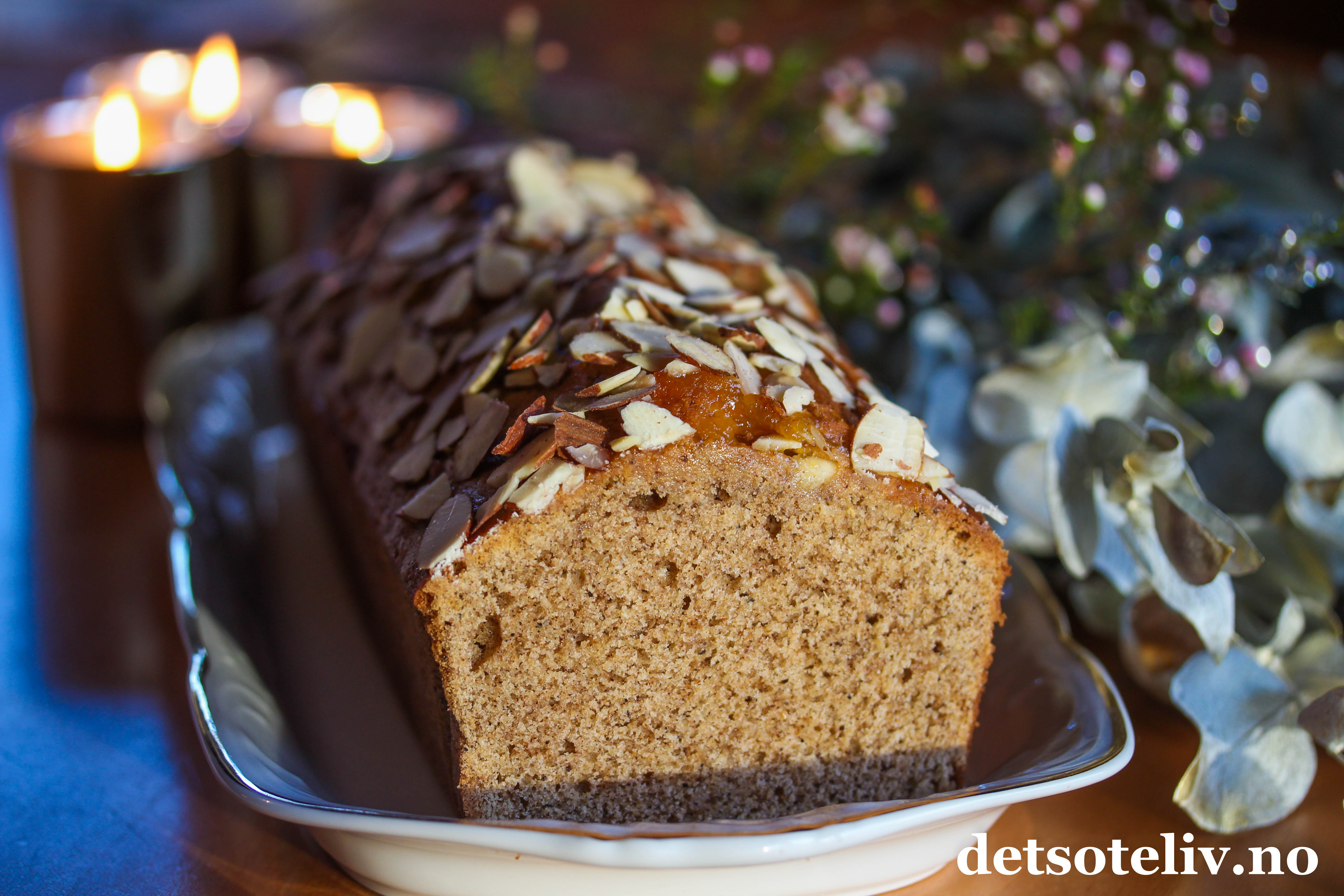 Her har du en fantastisk god og saftig krydderkake, som definitivt får "det lille ekstra" ved at den pensles med aprikossyltetøy og dekkes med mandelflarn rett etter steking.