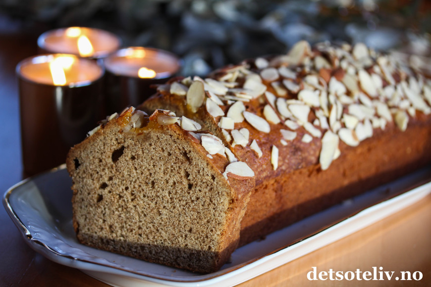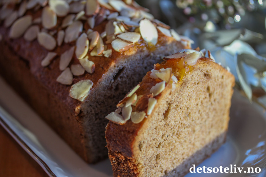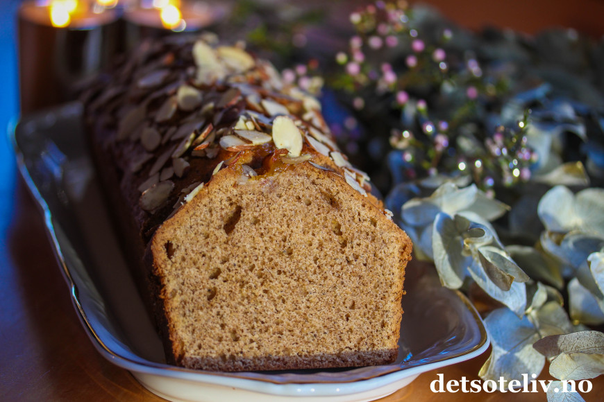 Her har du en fantastisk god og saftig krydderkake, som får "det lille ekstra" ved at den pensles med aprikossyltetøy og dekkes med mandelflak rett etter steking.