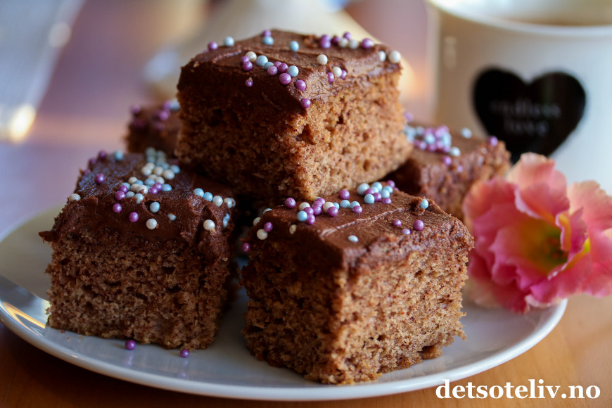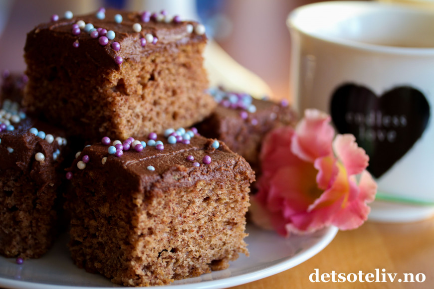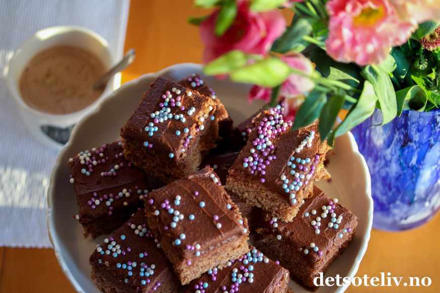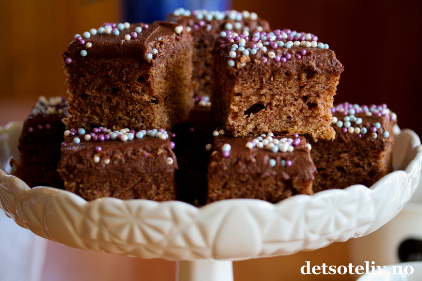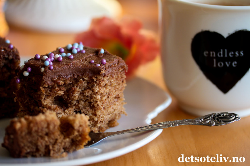 Glasuren smaker sjokolade og kaffe, og er kjempegod sammen med kryddersmaken på kaken.