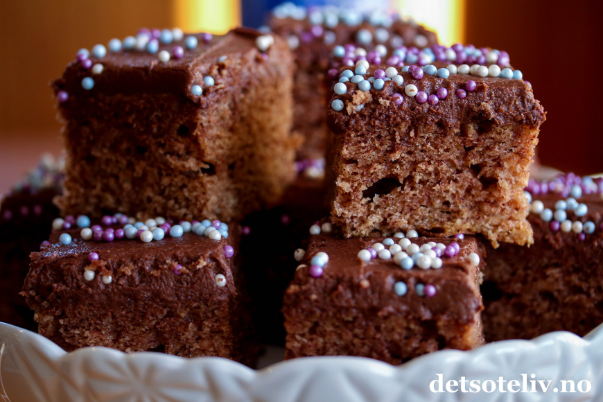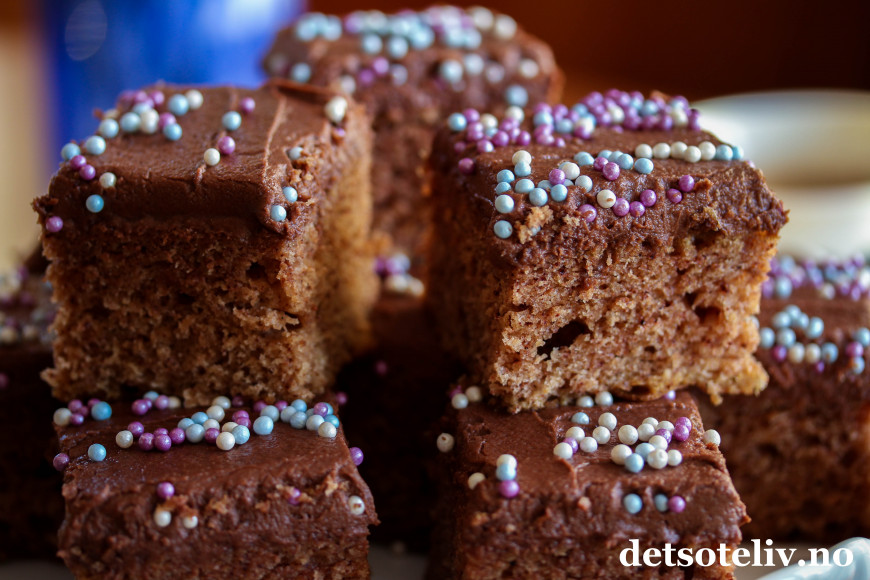 Hell deigen i en stor, bakepapirkledd langpanne (ca 30x40 cm). Stek kaken midt i ovnen ved 180°C i ca. 30 minutter, til kaken er gjennomstekt.