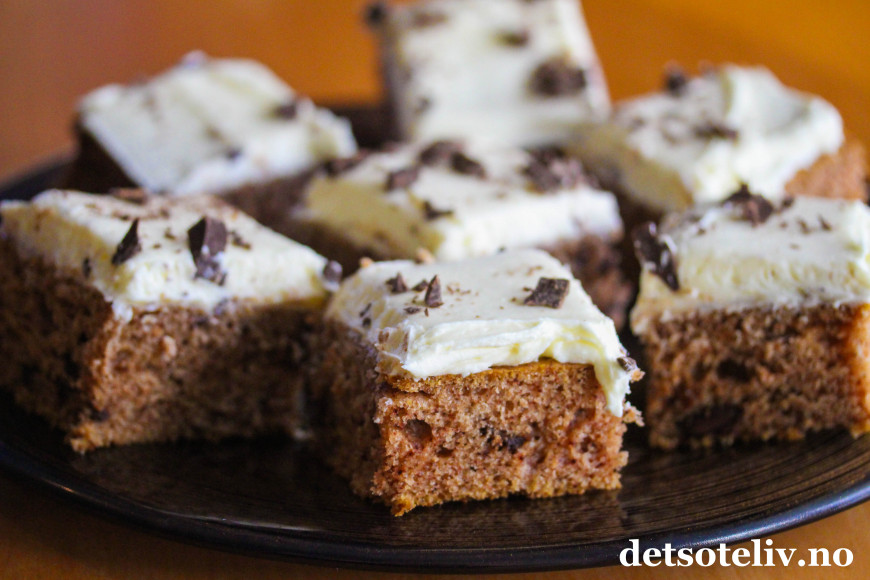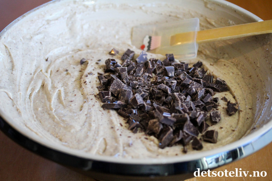 Jeg fikk tips av en leser om å tilsette litt hakket, mørk sjokolade i deigen. Dette tipset måtte jeg selvsagt teste ut, og mer skulle det ikke til for å gjøre denne kake både litt annerledes og veldig, veldig god (selv om den jo var kjempegod fra før også). Ja så god at mannen min presterte å si at dette er en av de bedre kakene han har smakt på lenge (!), og det er jo nesten litt flaut med tanke på at dette også er blant de aller enkleste kakene på bloggen...