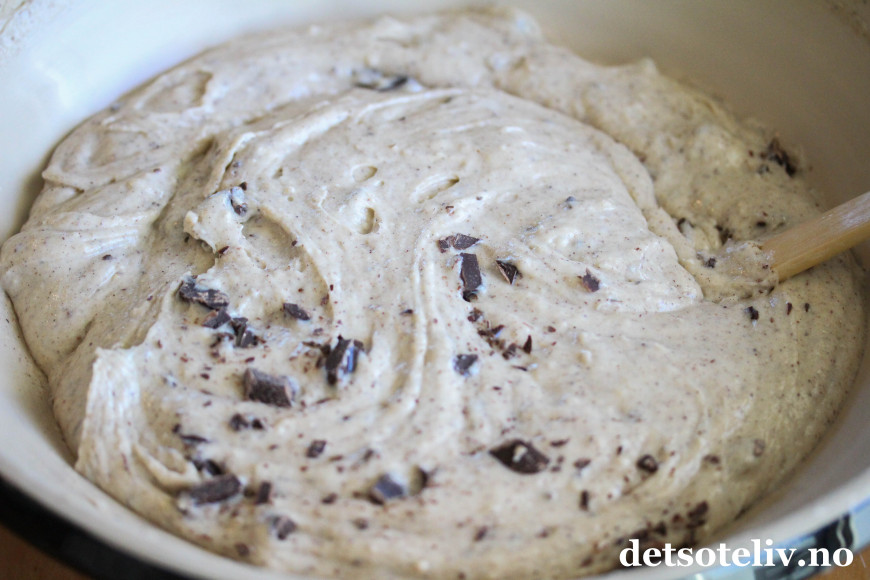 Smelt og avkjøl smøret. Ha surmelken i en stor rørebolle. Tilsett sukker, natron, krydder og vaniljesukker. Rør godt. Tilsett det smeltede smøret og bland i. Tilsett hvetemelet og rør deigen sammen til den er jevn og klumpfri. Vend i grovt hakket sjokolade.