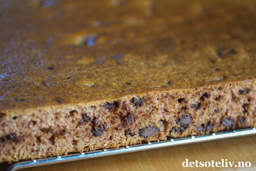 Hell deigen i en stor, bakepapirkledd langpanne (ca 30x40 cm). Stek kaken midt i ovnen ved 180 °C i 35 minutter, til kaken er gjennomstekt. Avkjøl kaken helt i formen. Hvelv kaken ut av formen og fjern bakepapiret.