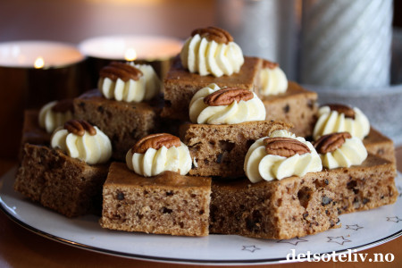 "Krydderruter med pecannøtter" er kjempesaftige kakestykker med nydelig smak av krydder og nøtter! Krydderkaken pyntes med smørkrem og hele pecannøtter.