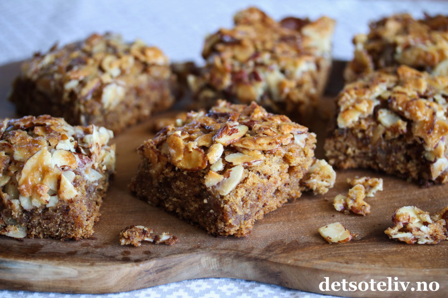 Kaken er rask å bake og lages i stor langpanne. Kjekt å ha på lur i fryseren!