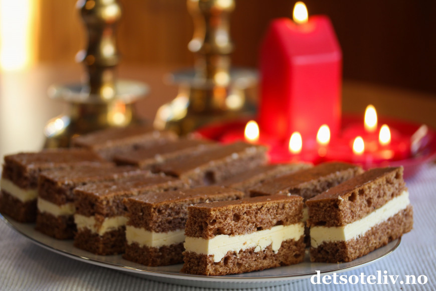 Rør sammen mykt smør, vaniljesukker og melis. Legg firkantene sammen med et tynt lag smørkrem i midten. Del dem deretter opp i smale, rektangulere kakestykker.