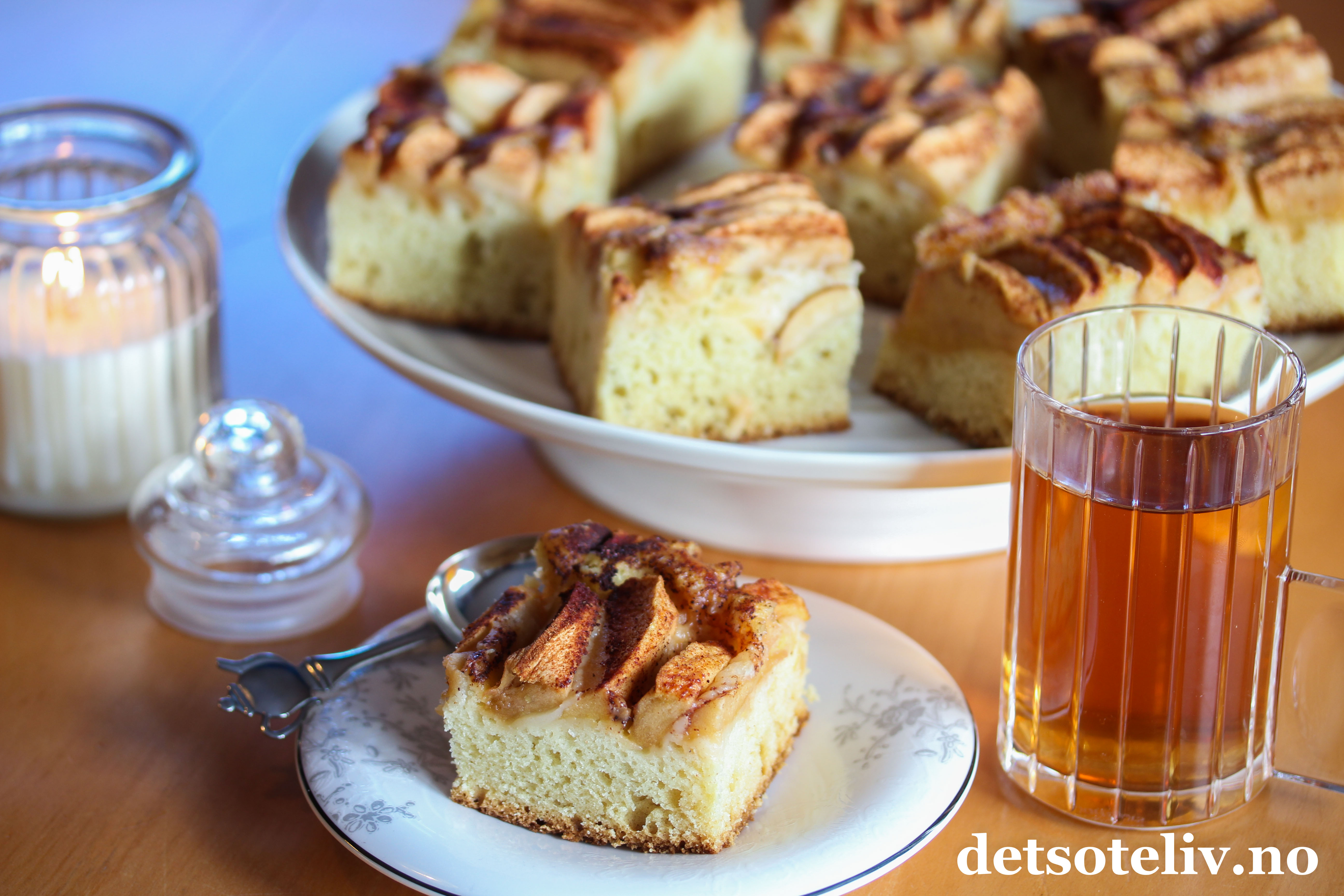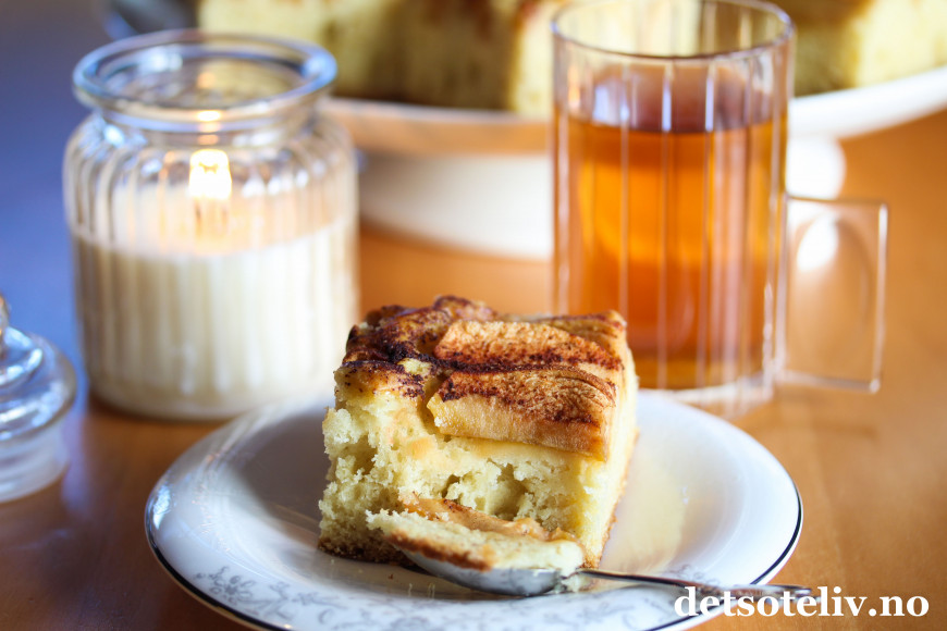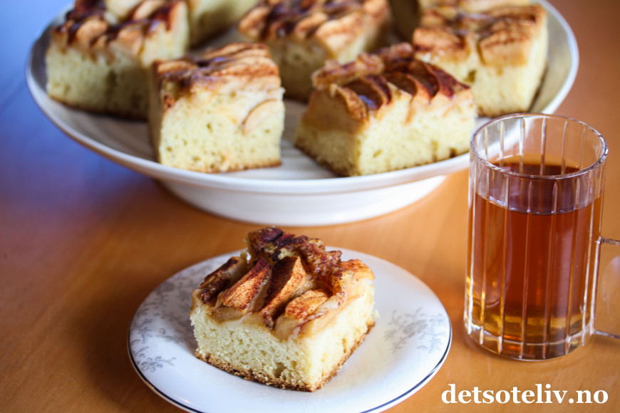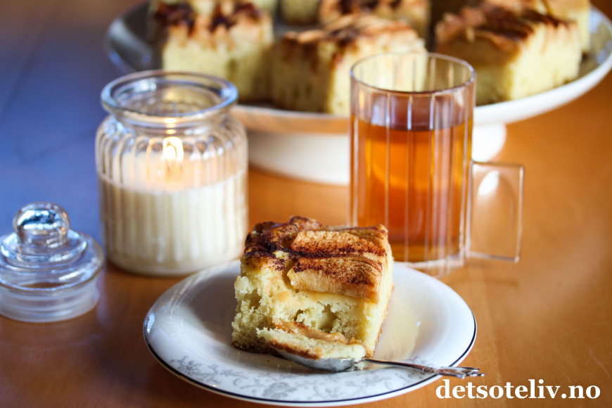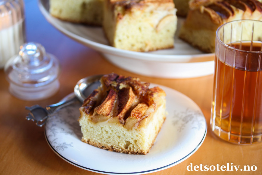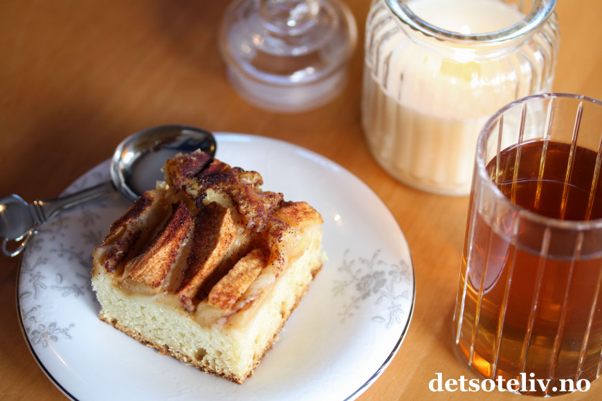 Nystekt eplekake smaker nydelig med varm, nytrukket te.