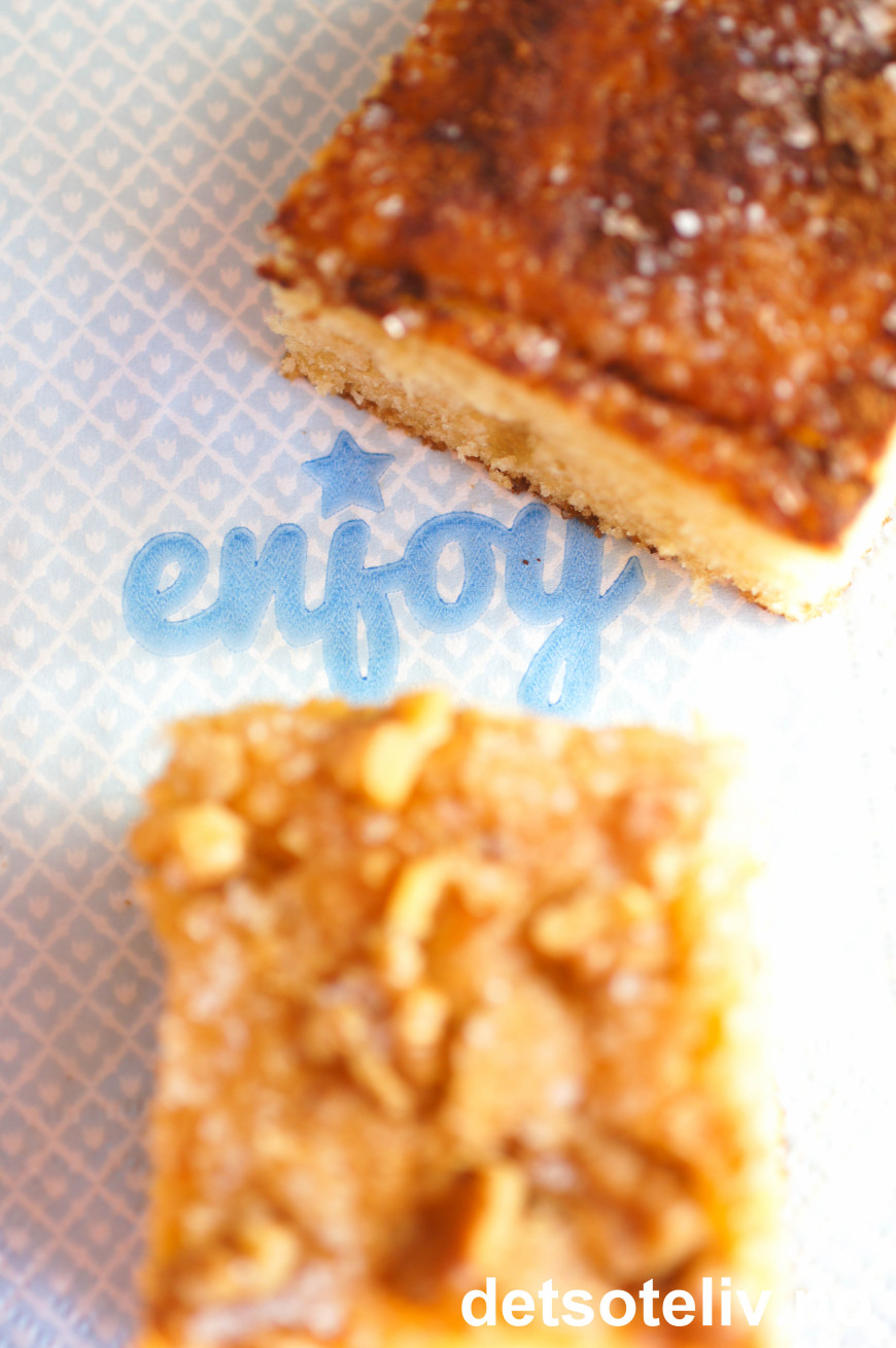 Ha deigen i en stor, bakepapirkledd langpanne (ca. 30 x 40 cm). Strø over hakkede valnøtter og perlesukker.