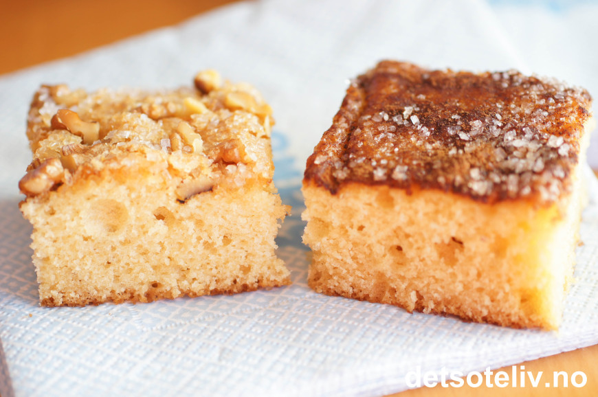 Kaken på bildet er drysset med perlesukker og hakkede valnøtter.