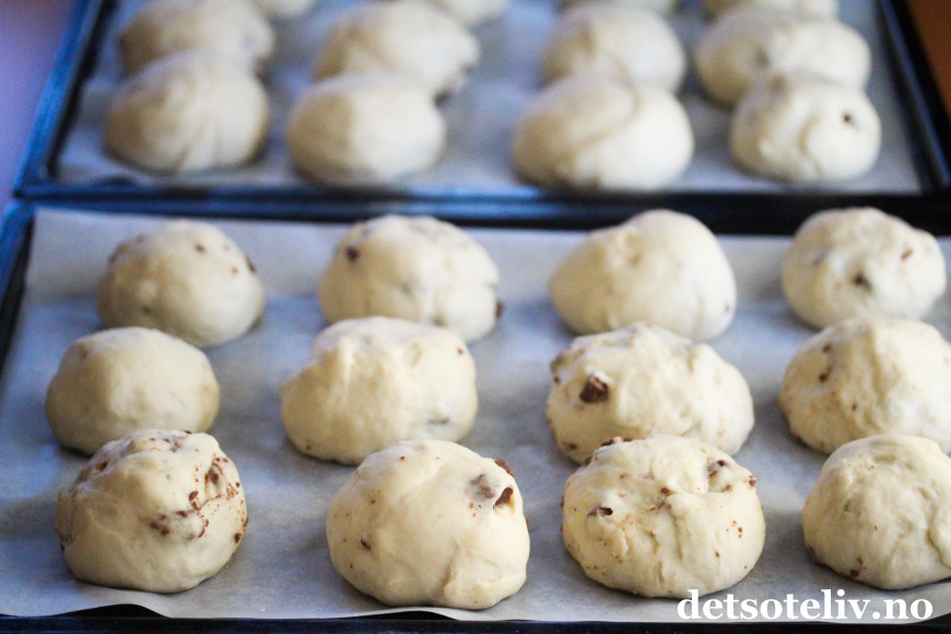 Del deigen i 15–20 jevnstore emner og trill hvert emne til runde boller. Legg dem på bakepapirdekkede stekeplater. Etterhev i 45 minutter.
