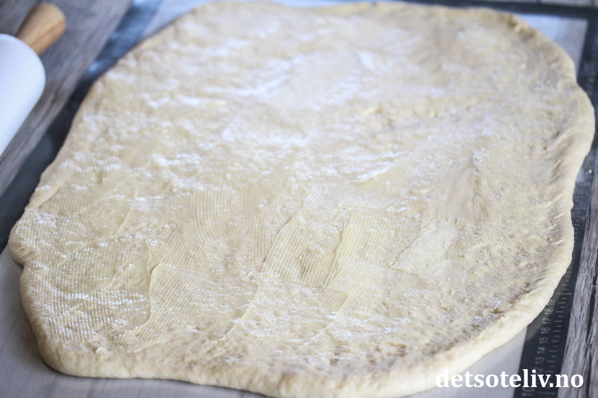 Kjevle ut deigen til en stor rektangel på melet bakebord.