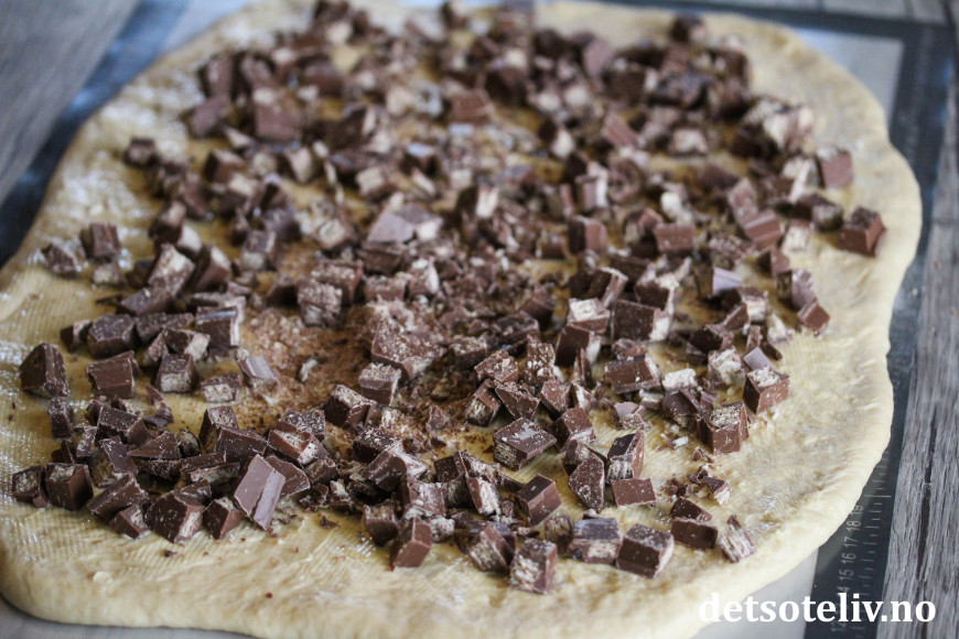 Hakk Kvikk Lunsj-sjokoladene opp i biter og dryss over deigen.