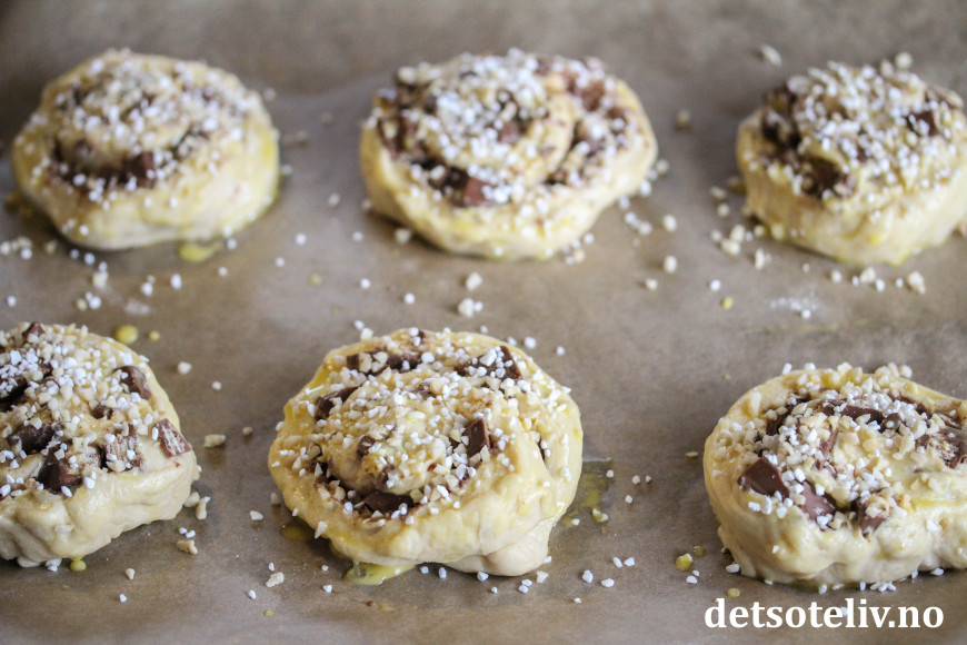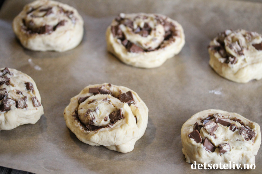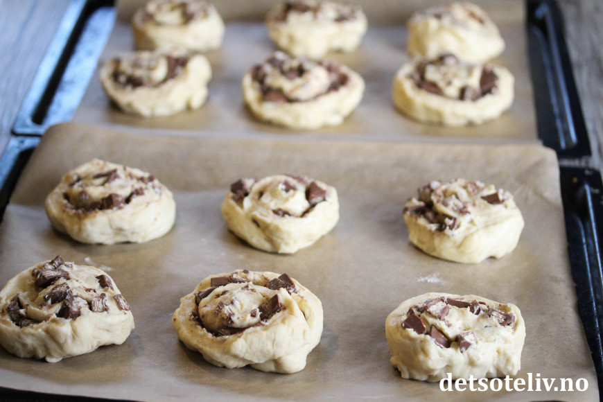 Rull sammen deigen fra langsiden til en stram rull. Skjær rullen i tykke skiver som legges på bakepapirdekkede stekeplater. La snurrene etterheve i 30 minutter.