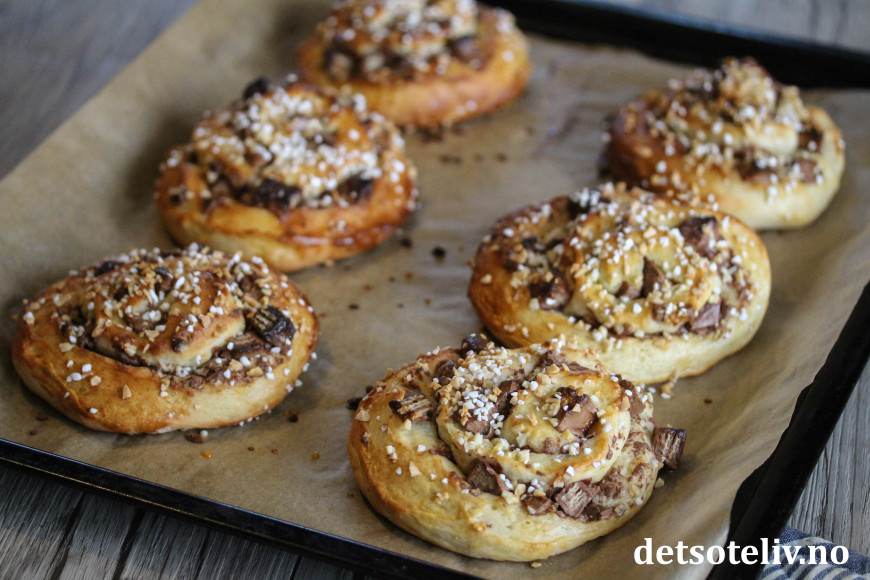 Her har jeg laget store, luftige snurrer som er fylt med smør og masse hakket Kvikk Lunsj-sjokolade. På toppen har jeg drysset hakkede mandler og perlesukker.