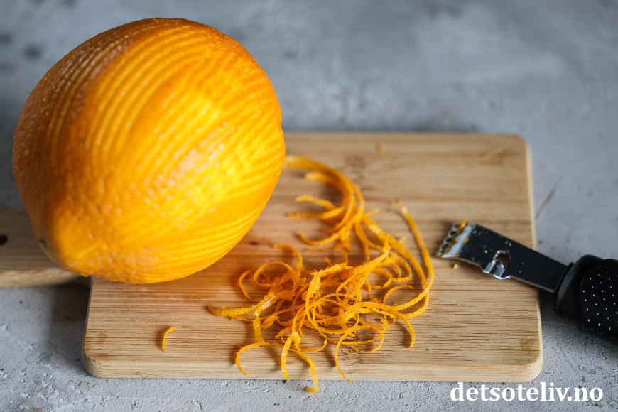 Vask appelsinen godt og riv fine strimler av appelsinskallet.