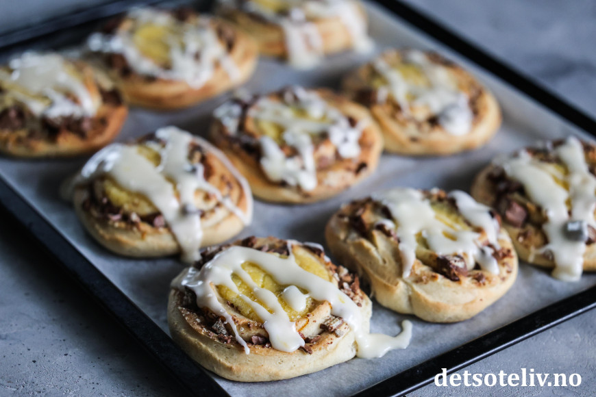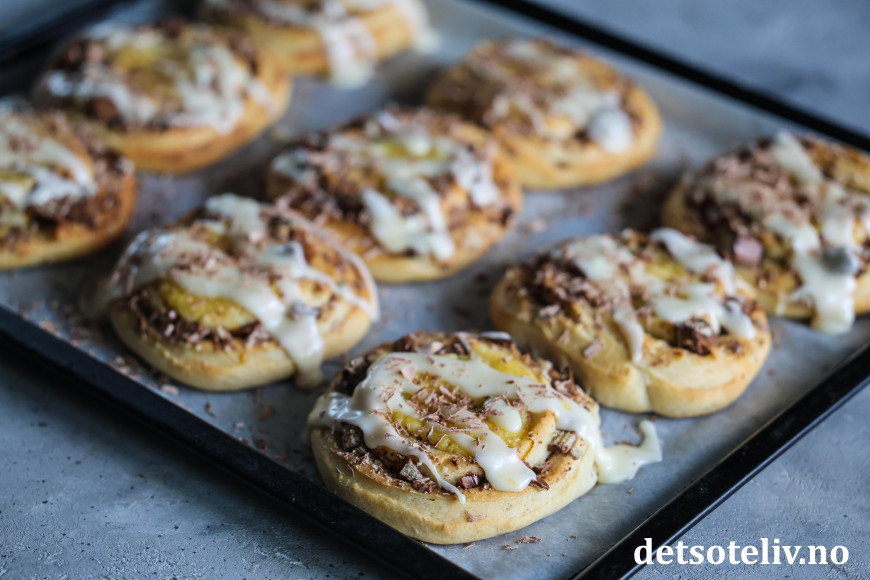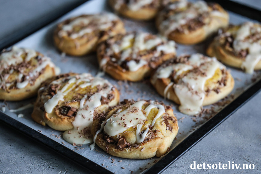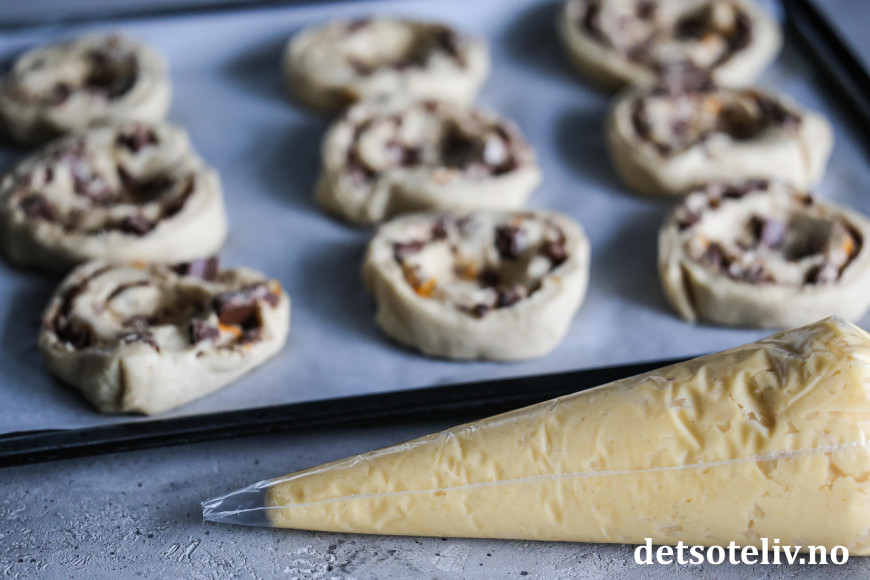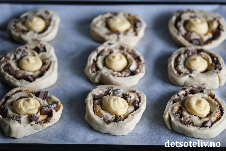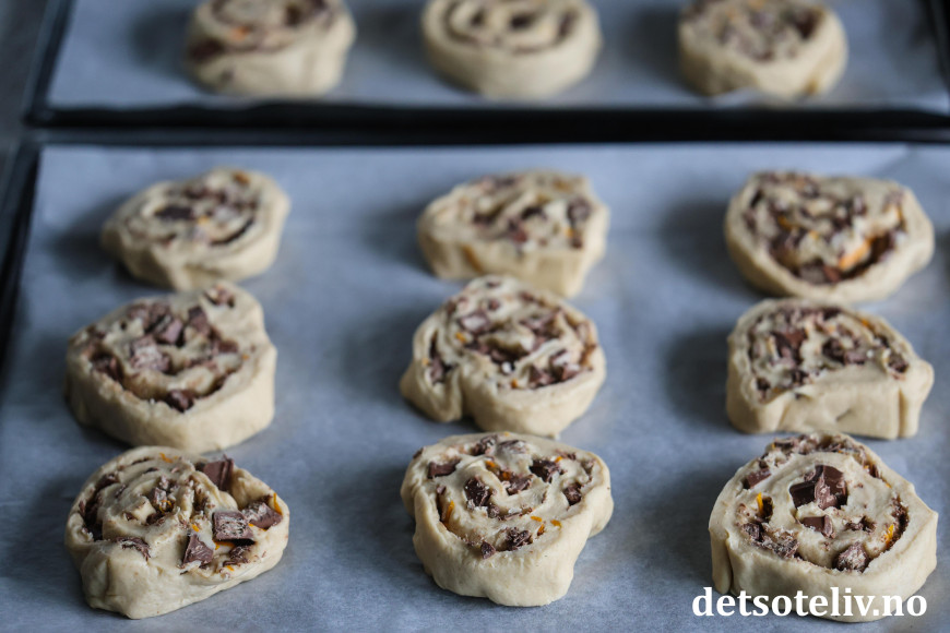 Rull sammen deigen fra langsiden til en stram rull. Skjær rullen i tykke skiver som legges på bakepapirdekkede stekeplater. La snurrene etterheve i 30 minutter.