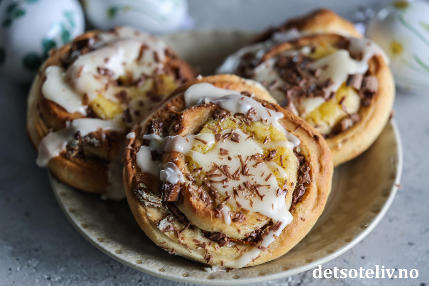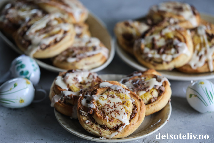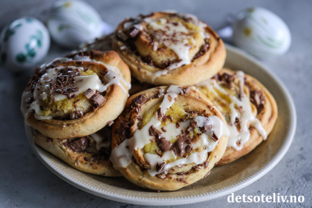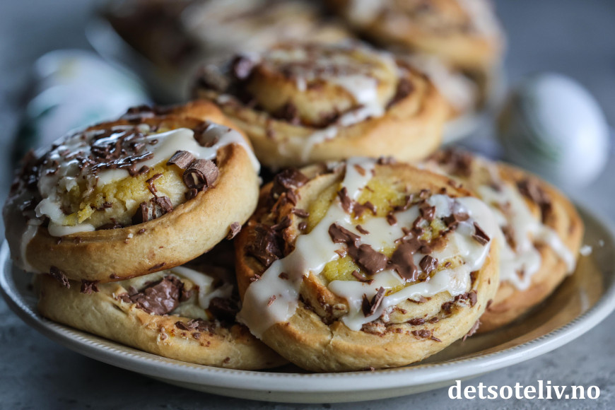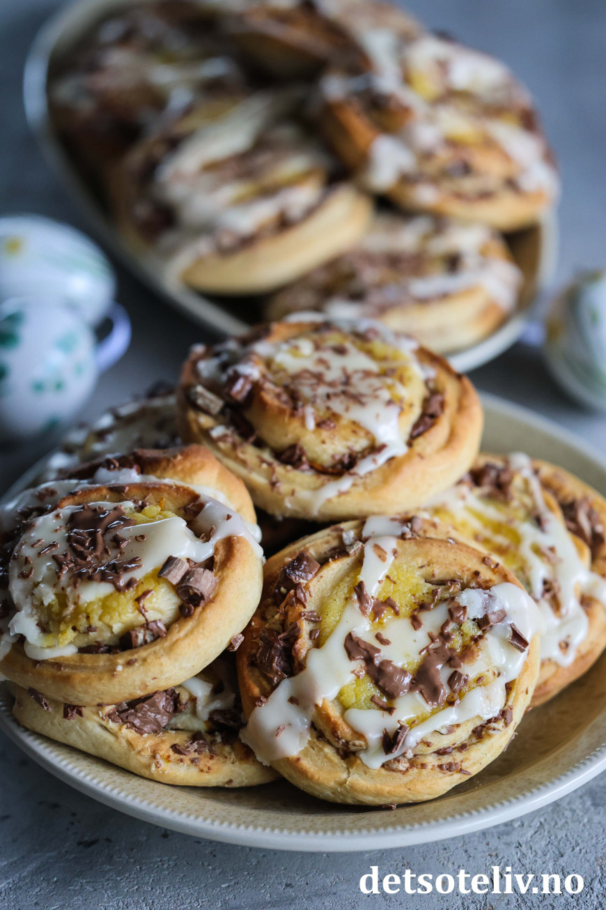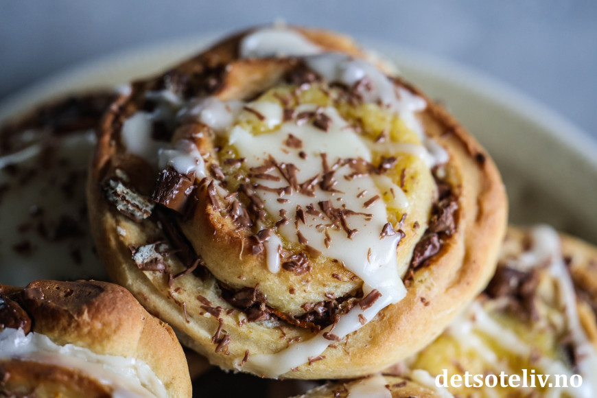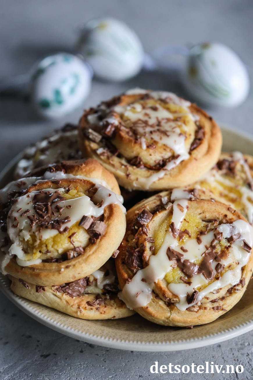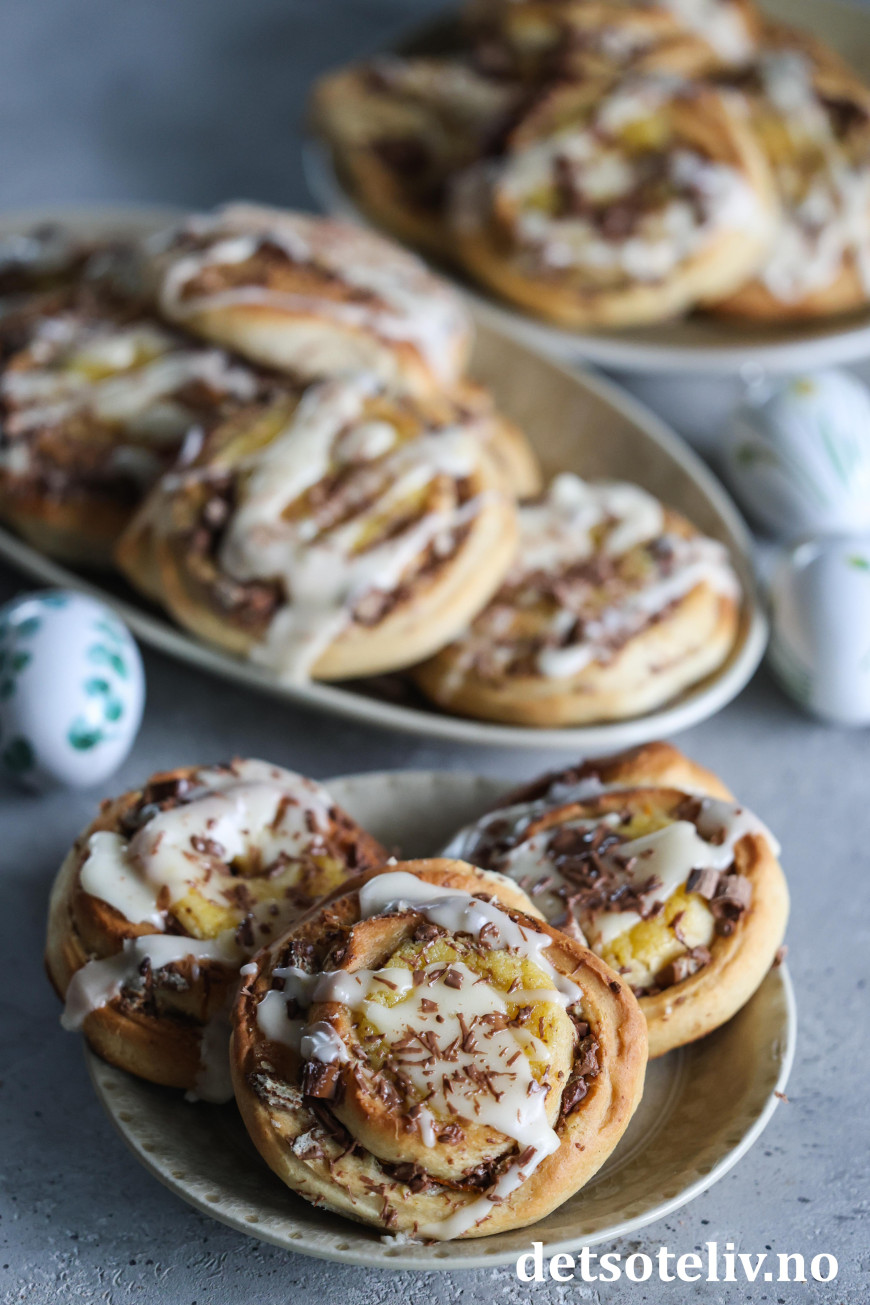 Nå er det lurt å planlegge årets påskebakst! 😃 Dette er en påske-edition av Kvikk Lunsj-snurrer, som har vært populære her på Det søte liv i flere år. Denne gangen har jeg hatt revet appelsinskall i fyllet sammen med hakket Kvikk Lunsj, og dessuten fylt hver bolle med hjemmelaget vaniljekrem.