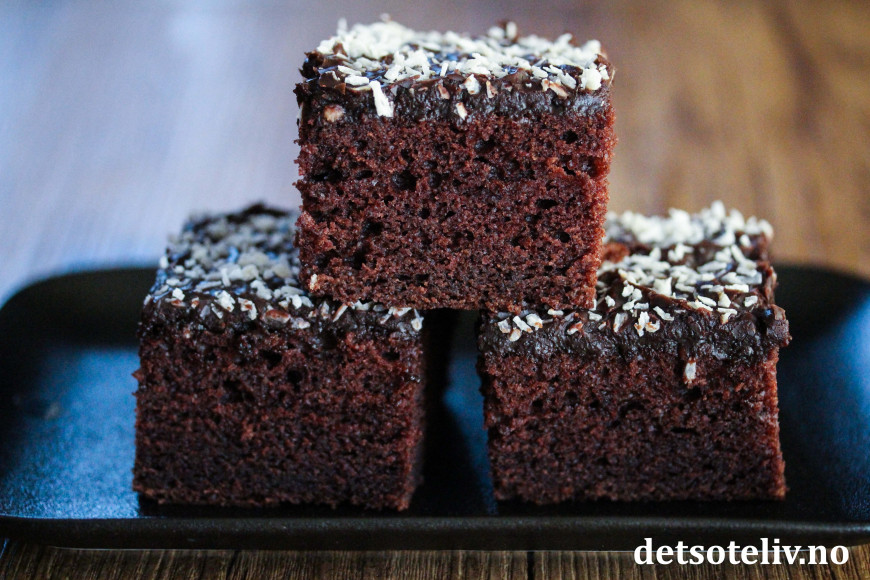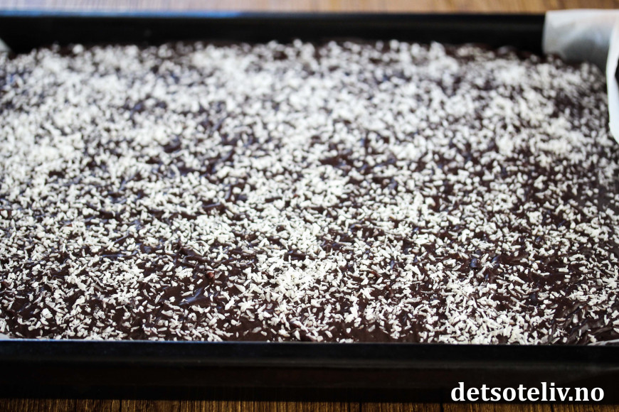 Smør sjokoladeglasuren over kaken og dryss over kokos. La kaken stå kjølig til glasuren har festnet seg før du drar kaken ut av langpannen og deler den i firkanter.