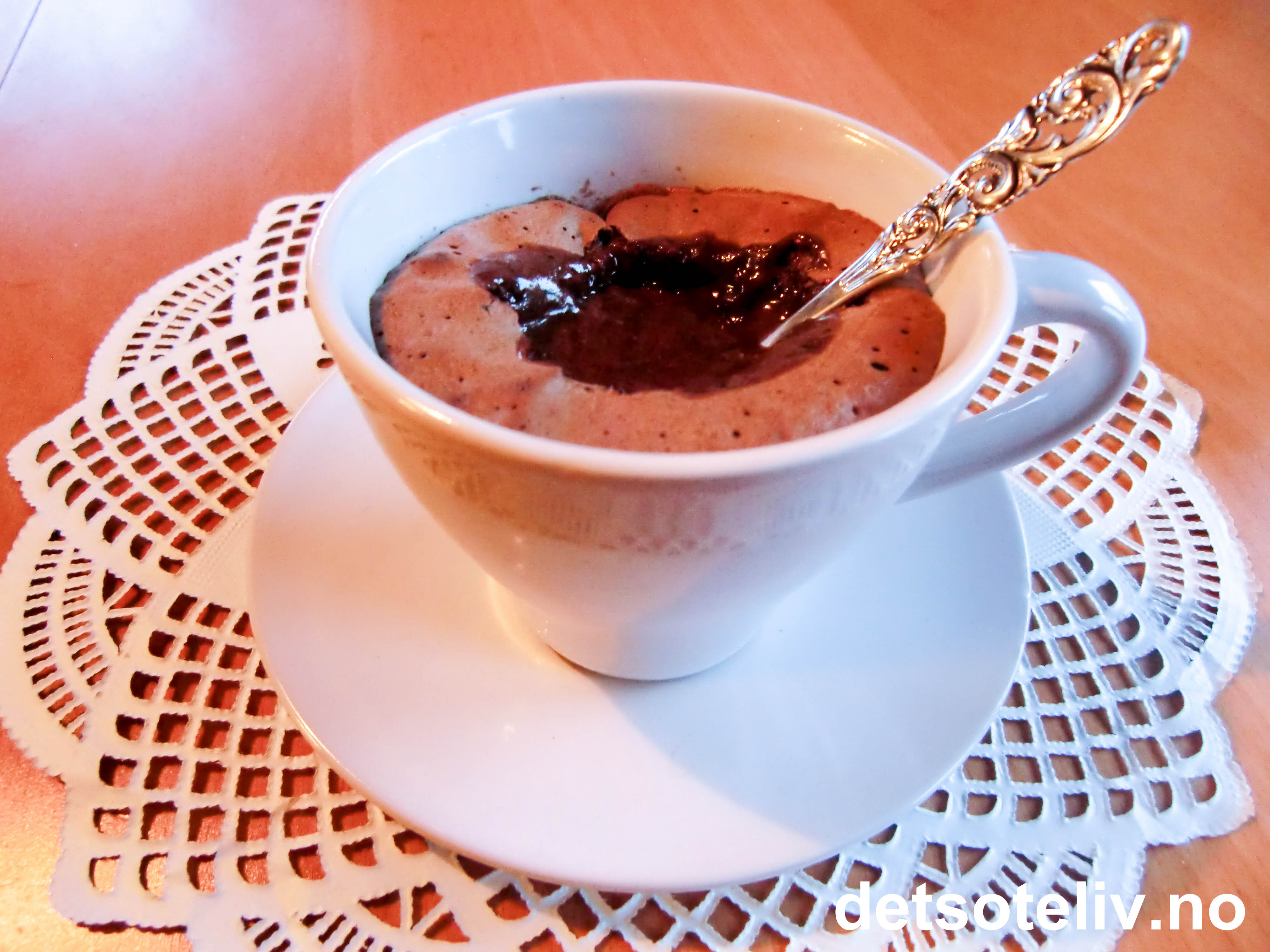 Hell røren i koppene så de blir ca 3/4 fulle. Stekes midt i ovnen ved 200°C i 10-12 min (se tips). Kakene skal være faste på toppen og flytende inni.