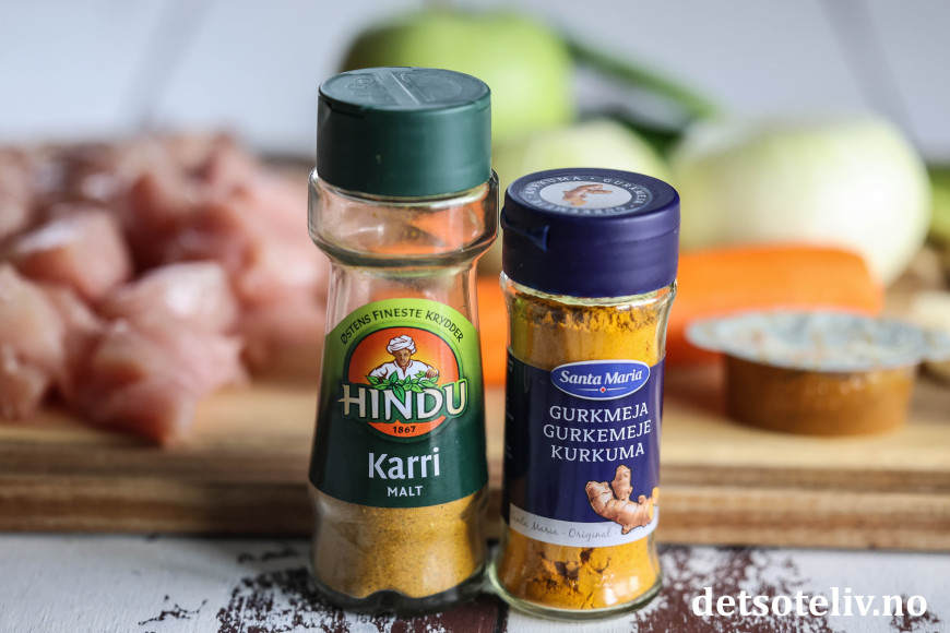 ♥ Som krydder bruker jeg her karripulver og gurkemeie. Karri er et indisk blandingskrydder som består av koriander, gurkemeie, pepper, spisskummin, bukkehornsfrø, chili og kardemomme. Merk at karri er mildere på smak enn krydderet som kalles for curry.