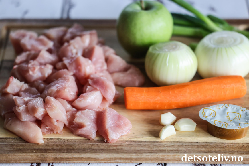 Finn frem ingrediensene. Skjær kyllingfilet i terninger.