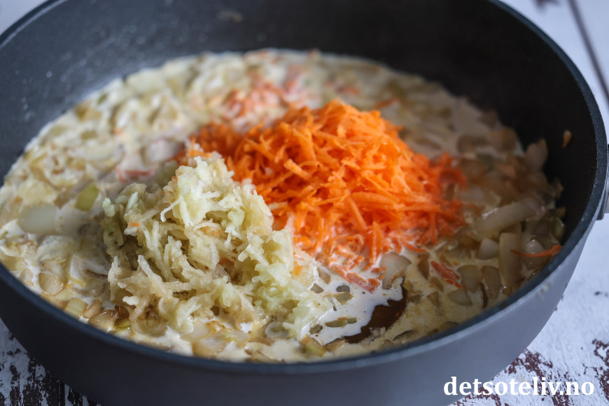 Tilsett matfløte og kyllingfond. Skrell eplet og riv det fint på et rivjern. Gjør det samme med gulroten. Ha både revet eple og gulrot i pannen. Bland godt og la dette koke sammen i noen minutter.