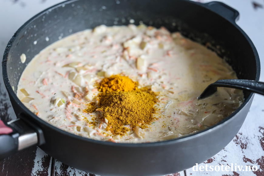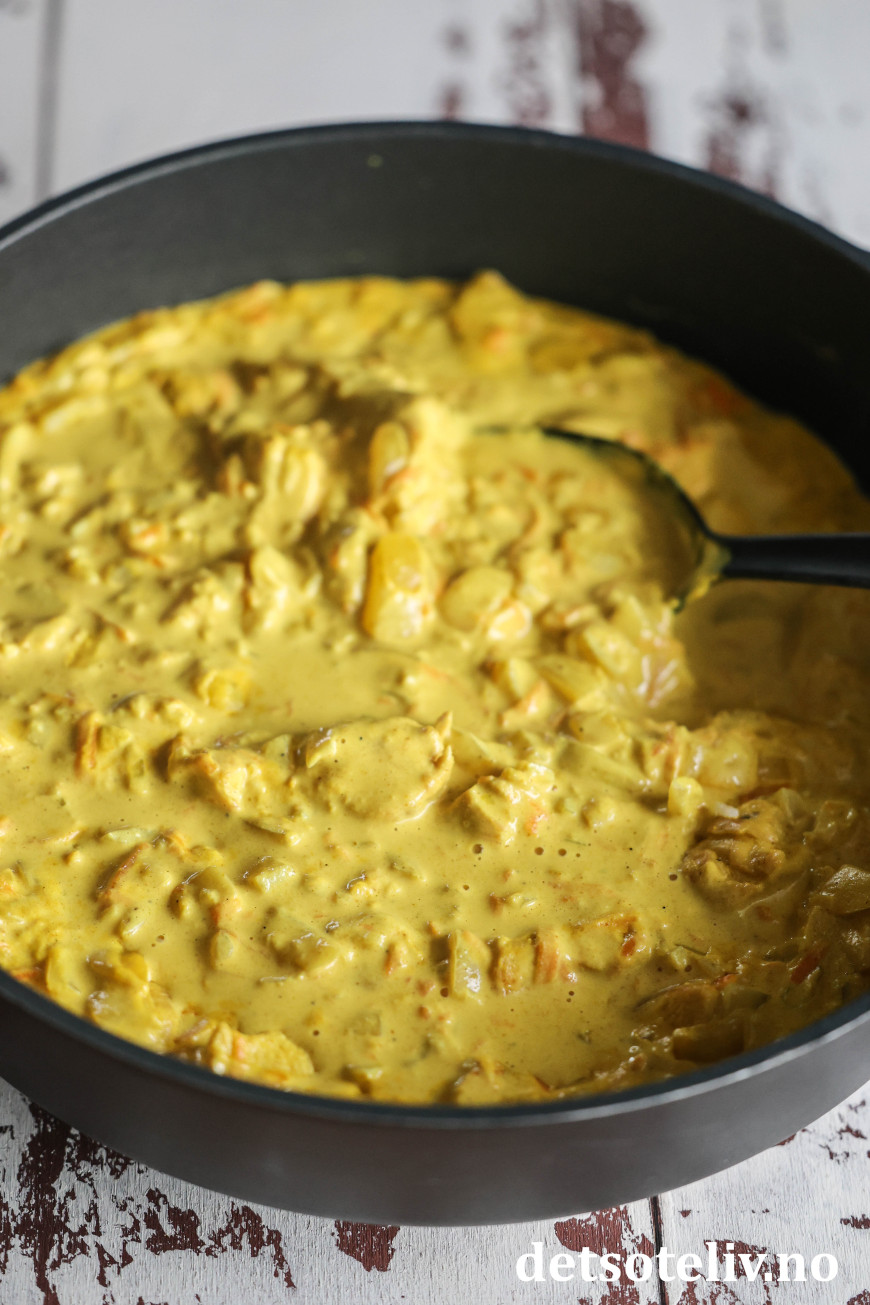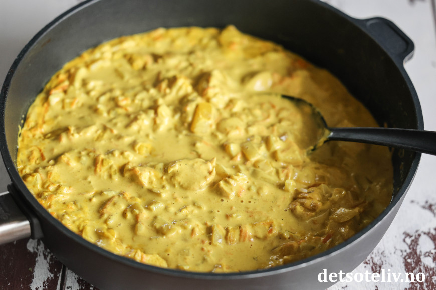Tilsett kokosmelk, karripulver og gurkemeie.