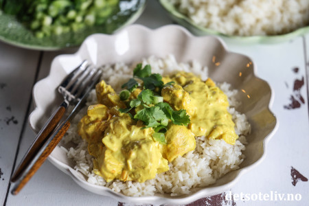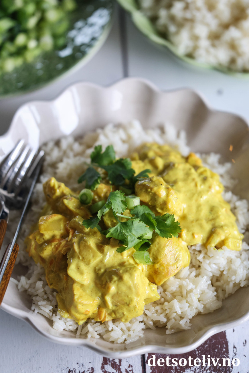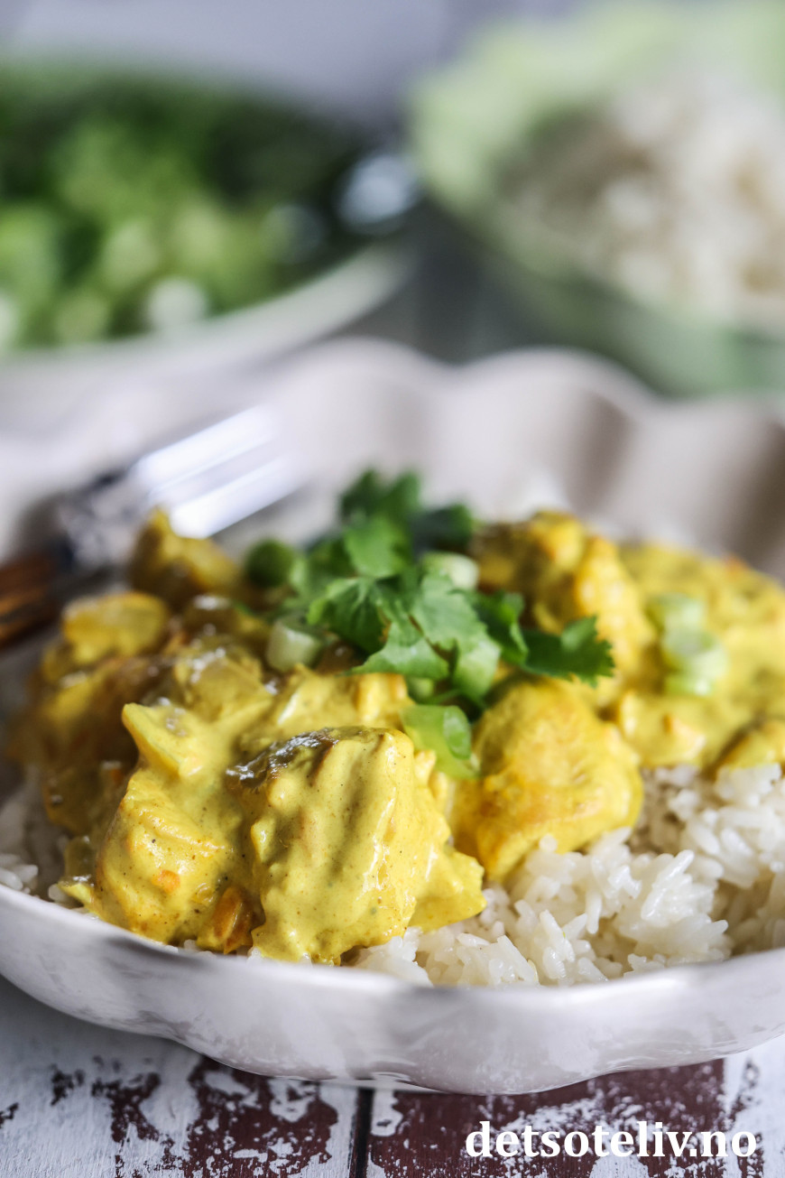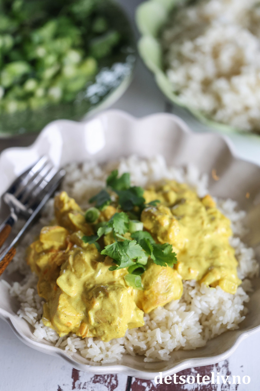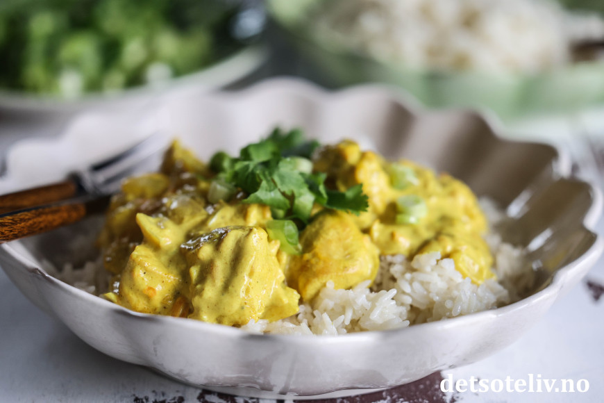 Kyllinggryten smaker godt av krydderet, men blir ikke sterk. Matfløte og kokosmelk gjør karrisausen deilig kremete.