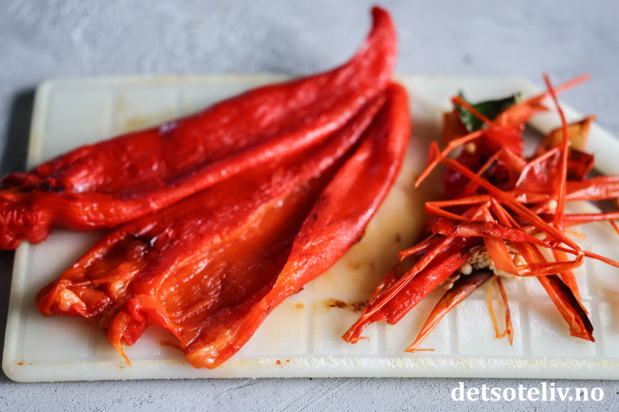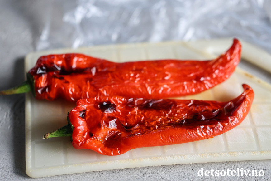 Start med å grille paprika i ovnen for å kunne flå dem og få frem den gode smaken: Legg paprikaene på en stekeplate og sett platen under grillelementet i stekeovnen. Ha høy varme (jeg bruker 230°C), og følg med underveis. Paprikaene skal klappe sammen og få sorte flekker på skallet (tar ca. 10 minutter). Ta paprikaene ut av ovnen og legg dem straks i en plastpose. Når paprikaene er avkjølt, kan du ta dem ut av posen. Dra forsiktig av det tynne, ytre skallet og rens paprikaene for frø på innsiden.