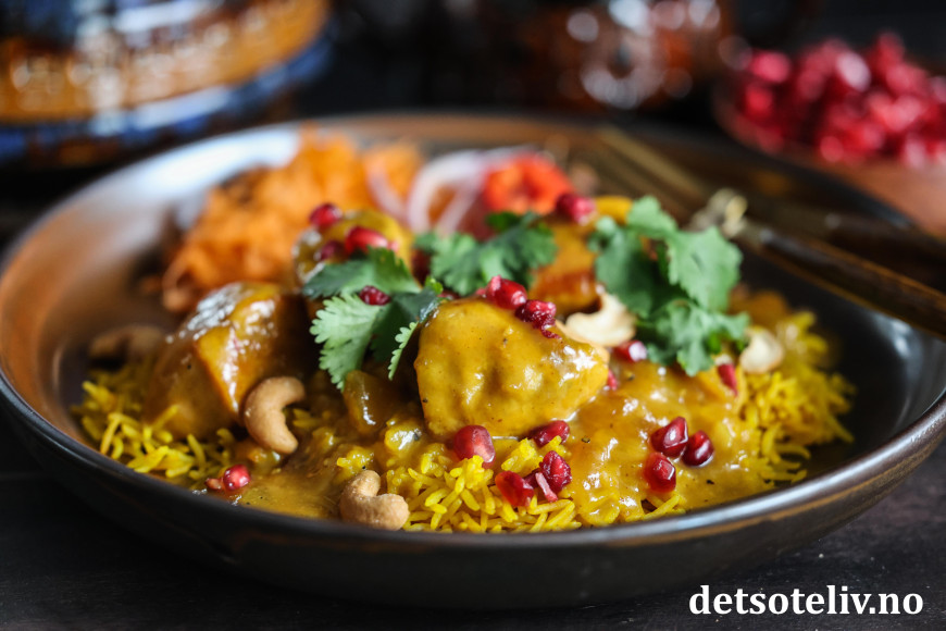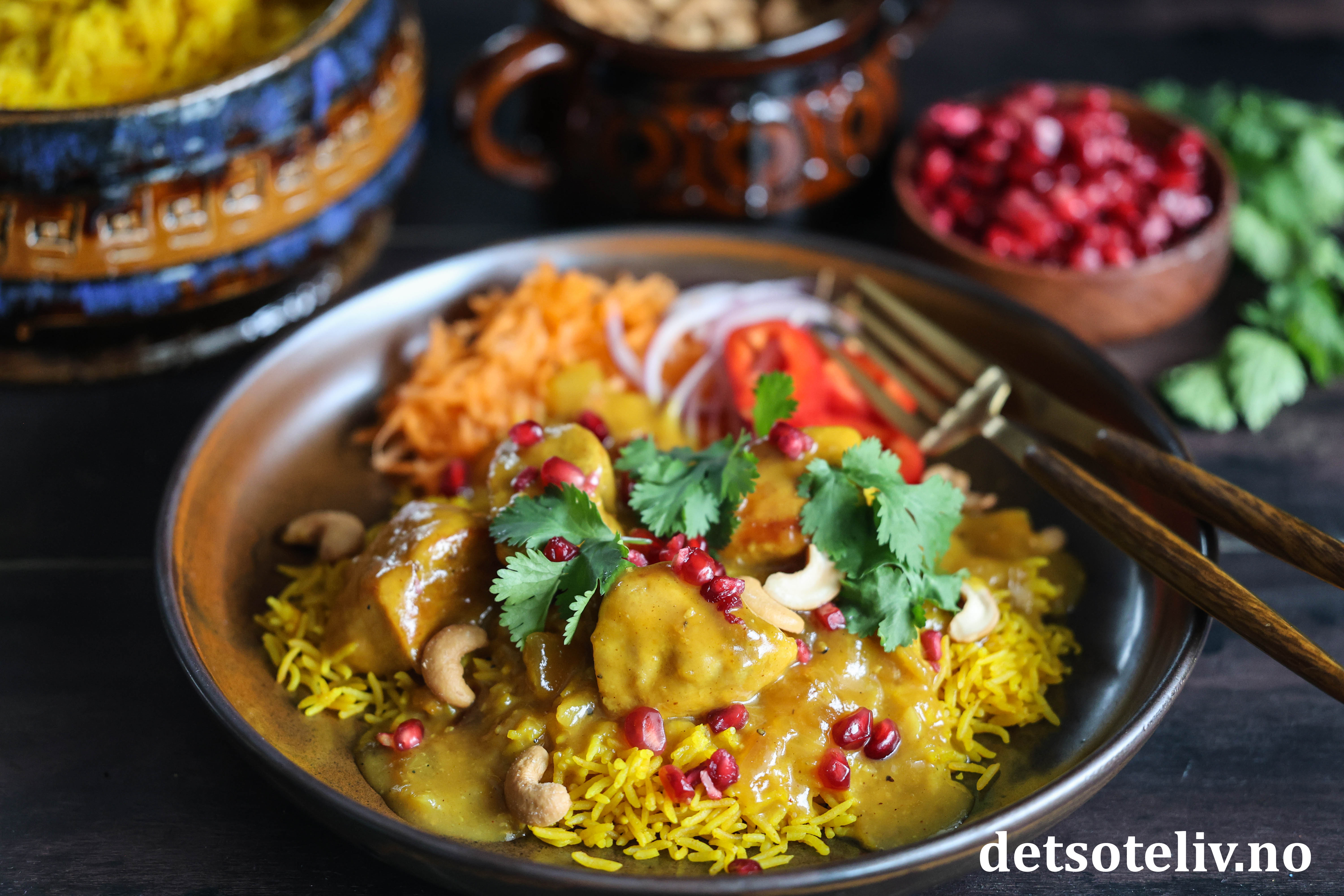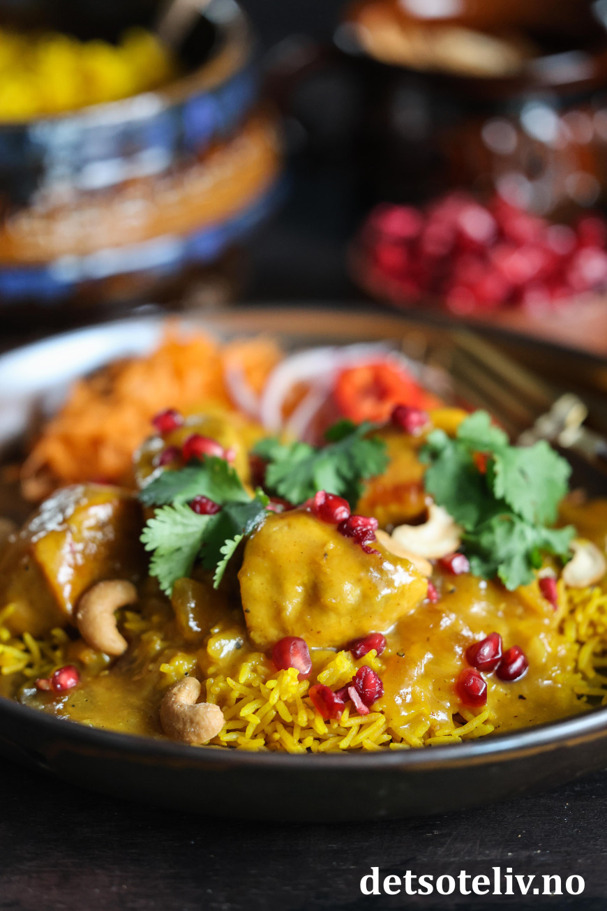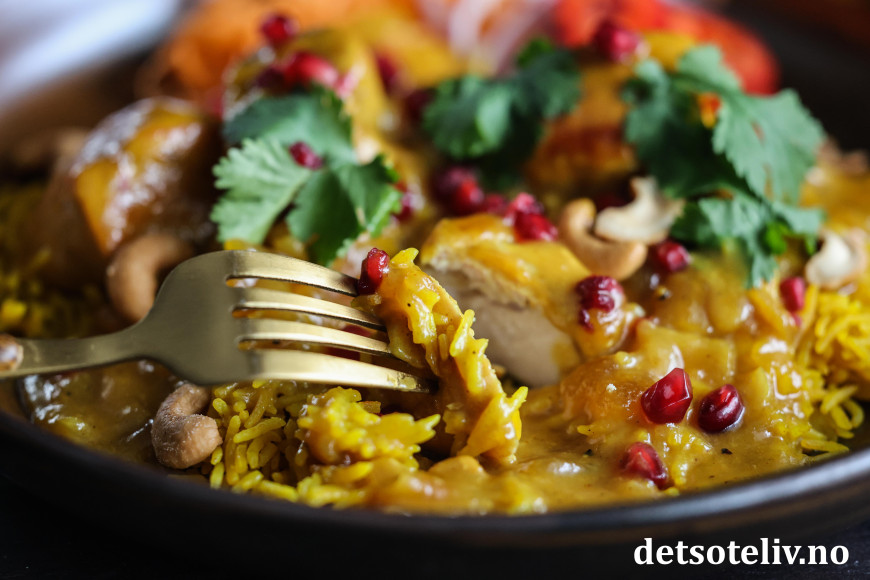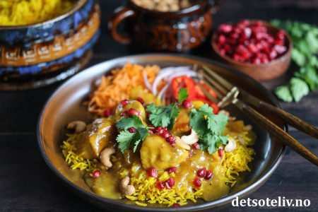 Jeg serverer kyllingcurryen med indisk gul ris, litt grønnsaker, cashewnøtter, granateplekjerner og frisk koriander for ekstra smak og farger.