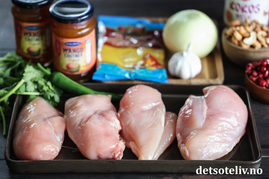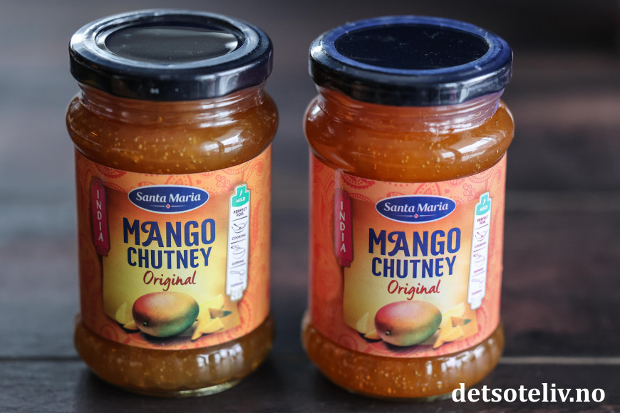 ♥ Med ferdigkjøpt mango chutney blir det veldig lettvint å lage denne kyllingcurryen. Som mango chutney bruker jeg 2 glass (à 350 gram) av denne typen fra Santa Maria. Veldig god på smak!