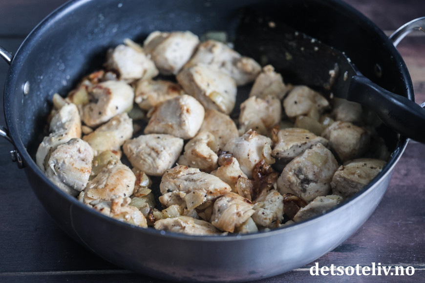 Ha kylling og løk i en store stekepanne sammen med olje. Stek kylling og løk på middels varme, til kyllingbitene har fått god stekeoverflate og løken er myk og gyllen. Krydre med salt og pepper.